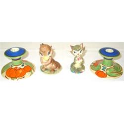 Pair of 1920's Clarice Cliff 'Fantasque' 'Lily' pattern candlesticks, shape number 310, gilt backstamp 'HAND PAINTED FANTASQUE BY CLARICE CLIFF NEWPORT POTTERY ENGLAND', one with additional gilt backstamp 'LAWLEYS' NORFOLK POTTERY STOKE', 3.2ins. high (see illustration). According to 'CLARICE CLIFF THE ART OF BIZARRE' by Leonard Griffin, this gilt Fantasque backstamp crediting Newport Pottery was only used briefly in 1928. Est.£100/150