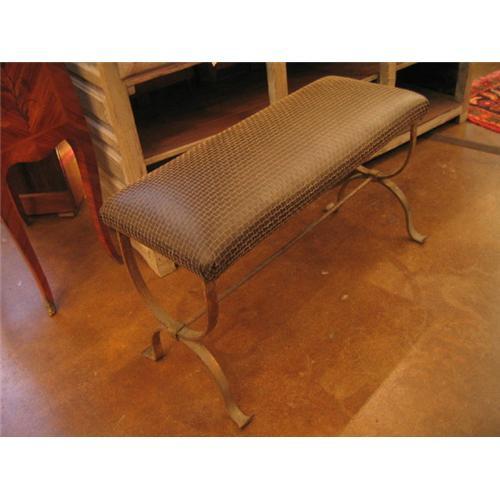 Pair of Spanish forged iron benches from Valencia, c. 1920. Elegant, simple lines. Reupholstered in an attractive stamped vinyl.