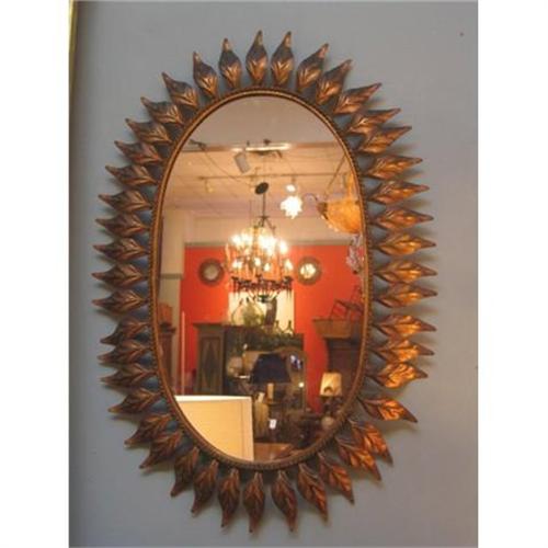 Pair of extremely unique 1920s Spanish gilded iron sunburst mirrors. Oval with gorgeously patined leaf rays. A rare pair.