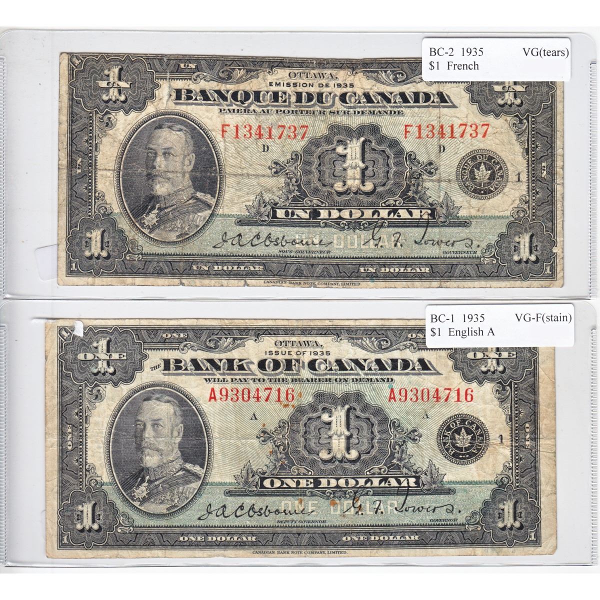 Pair of 1935 $1.00 Notes; one English and one French. Buyers Premium will be added on all items as per our terms of sale. We accept Paypal, Credit Card, E-Transfer Payments, Cheque or Money Orders (there is an additional 3% fee for using Paypal or Credit Card). All invoices will be emailed immediately following the auction, please contact us if you would like to pay by credit card or receive a new revised lower total for mailing in payment or sending an e-transfer (3% discount). All Items Are Sold "AS IS", no returns
