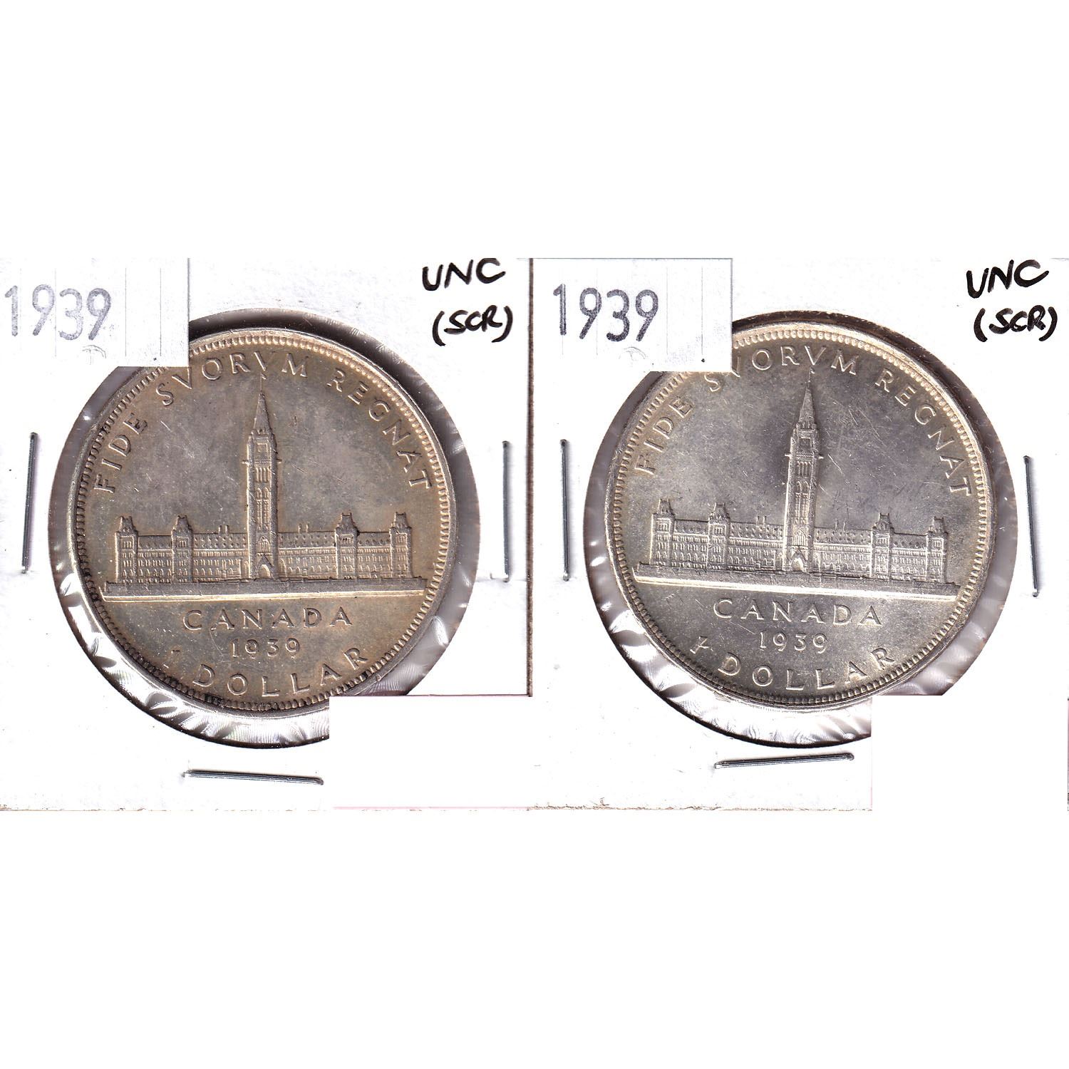 Pair of 1939 Canadian Commemorative Silver Dollars in UNC Condition (lightly scratched) 2Pcs.