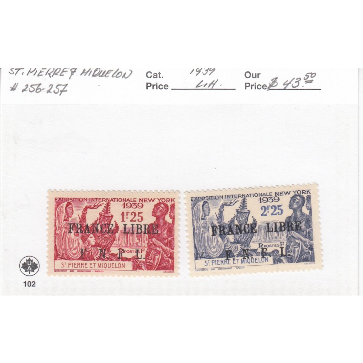 Pair of 1939 St. Pierre & Miquelon New York World fair 2F 25c Over printed "France Libre F.N.F.L "Stamps SC #256-257. 2pcs