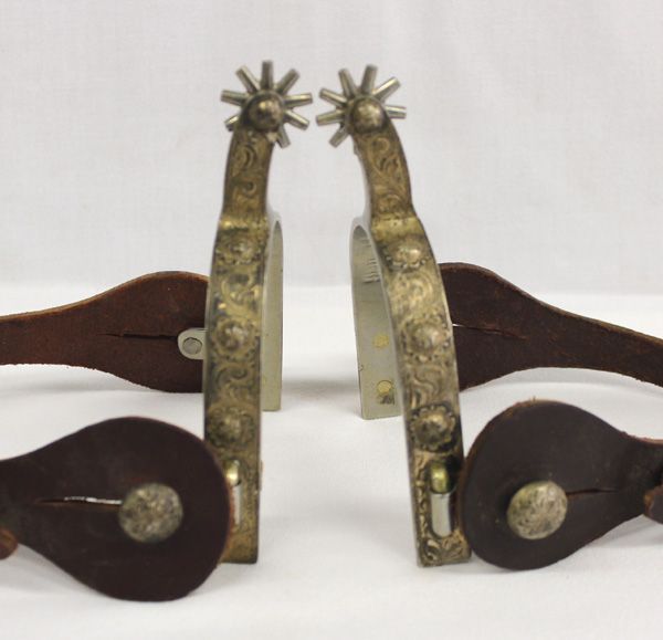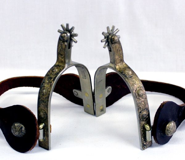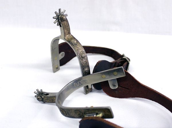Pair of 1940's CA Flemming Spurs. Single mounted and etched measurments approx.: 1'' Rowl, 1.5 '' Shank, with a heel width of 3 3/8''. Tested 800 silver.