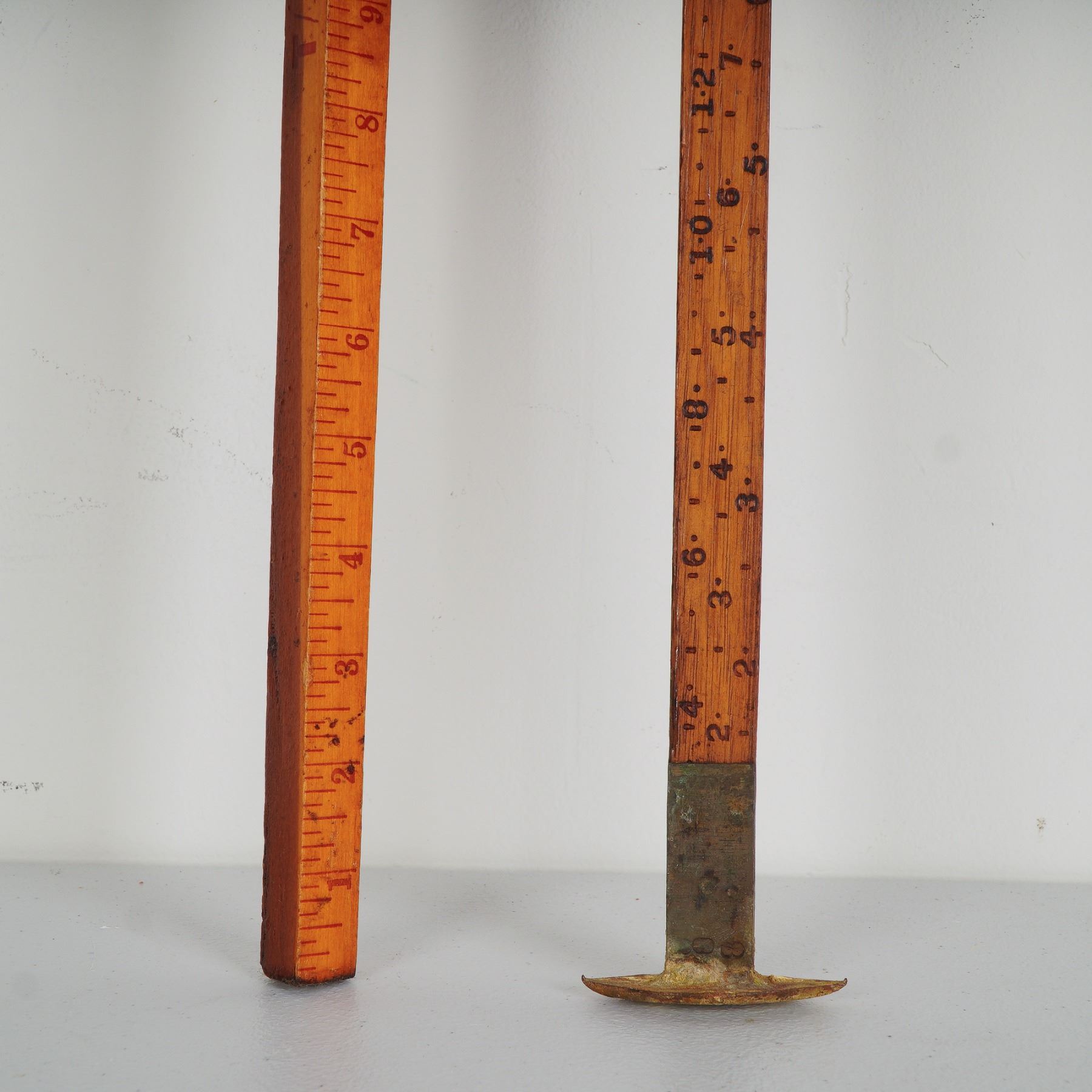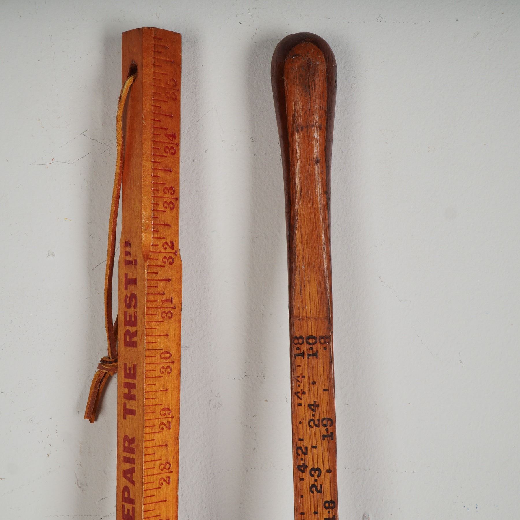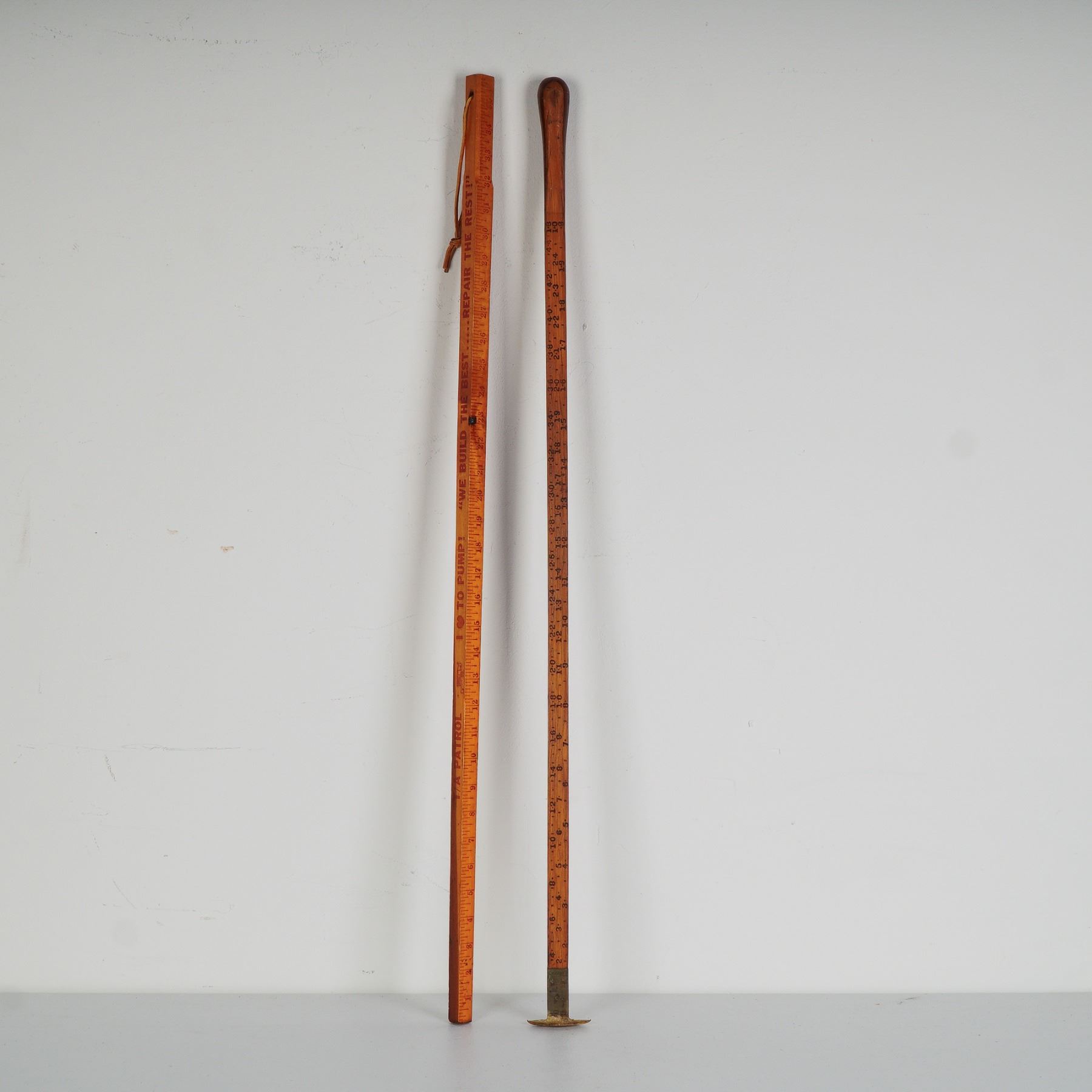 An intriguing pair of vintage measuring implements, each telling a story from America's mid-20th century industrial landscape. The first, a classic wooden gasoline measuring stick, retains its bold stenciled numerals and weathered patina, once indispensable in service stations for gauging the fuel level in underground tanks. Complete with metal fitting to the base, it shows honest wear from years of practical use. The second, a scarce Coconino Scribner Scale log rule, is a long wooden rule designed for foresters and sawyers to calculate board-foot yield from felled logs. With its calibrated notations and original finish, it embodies the rugged utility of the American logging trade. Together, these tools present a fascinating juxtaposition of petroleum history and forestry tradition, ideal for collectors of Americana, industrial antiques, or rustic display.