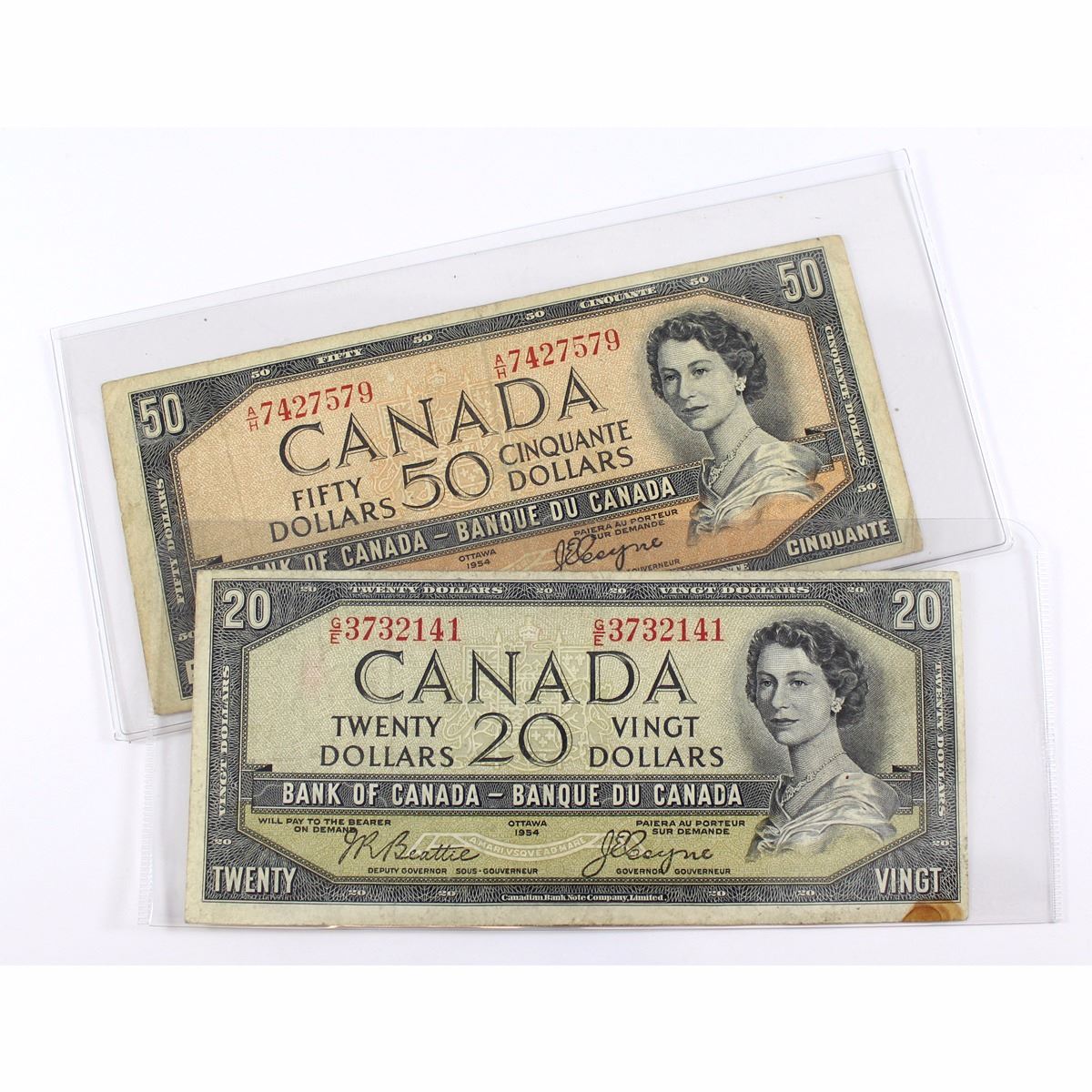 Pair of 1954 Modified Portrait Banknotes, one $20.00 Canada Note and one $50.00 Canada Note