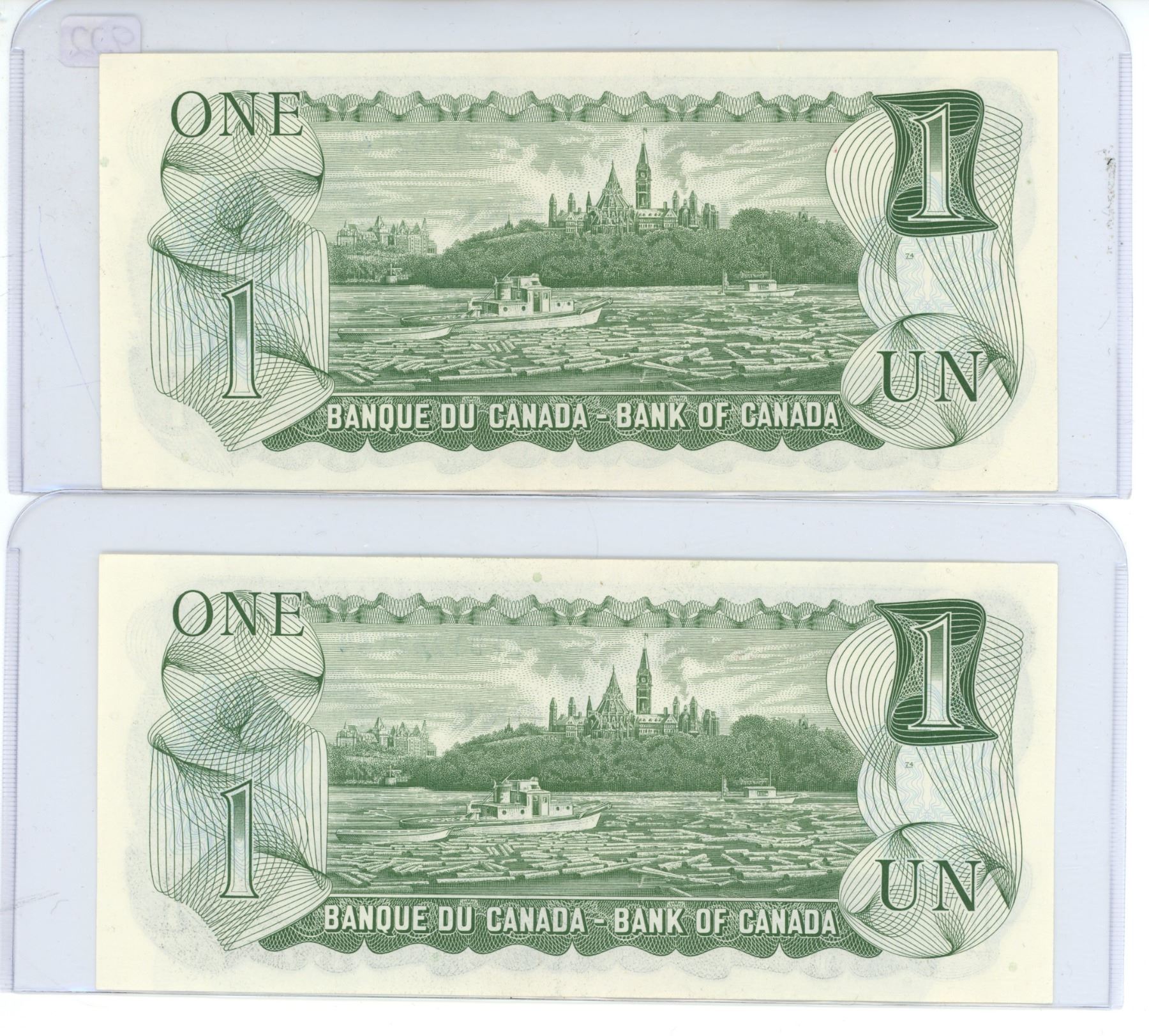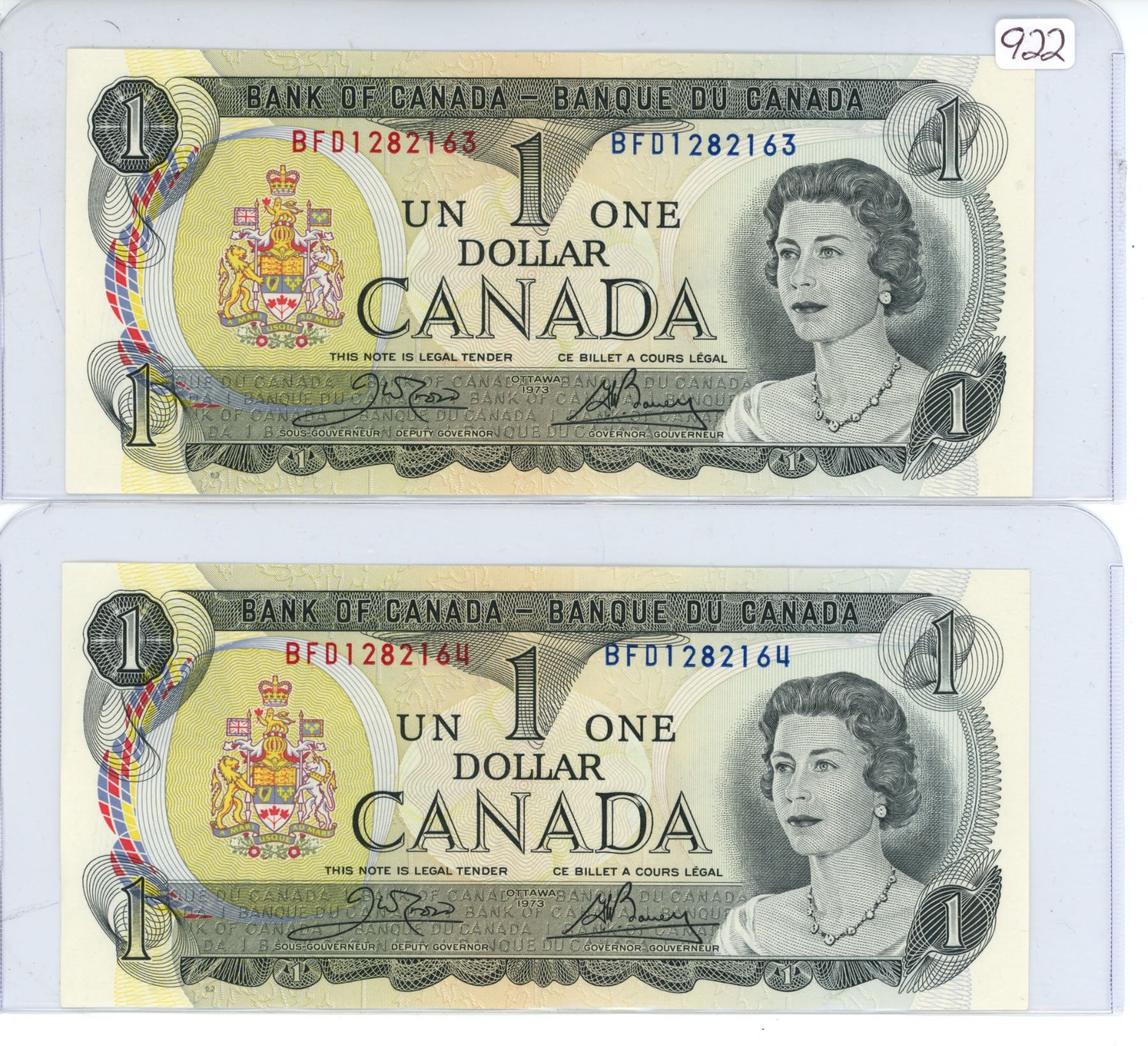 Pair of 1973 Canadian 1 dollar consecutive bills - Crow/Bouey - BFD 1282163-64