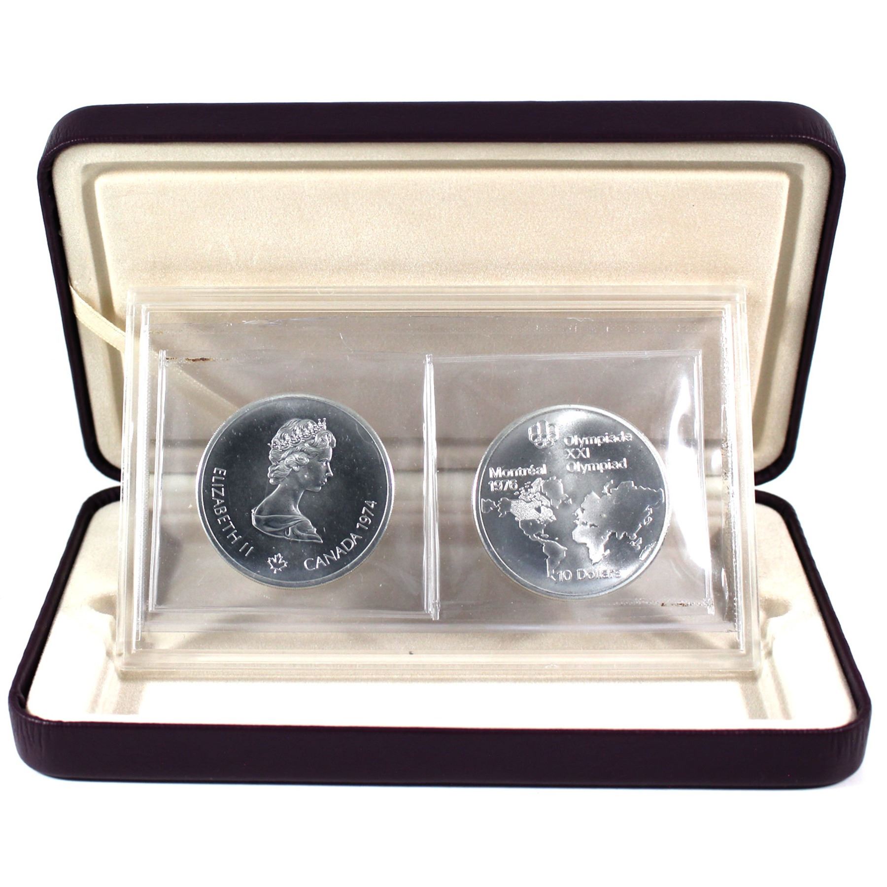 Pair of 1973 Montreal Olympics $10 Sterling Silver Coins Including the Map Mule with 1974 Date. Scarce! Coins come in sealed plastic and encapsulated in display case.