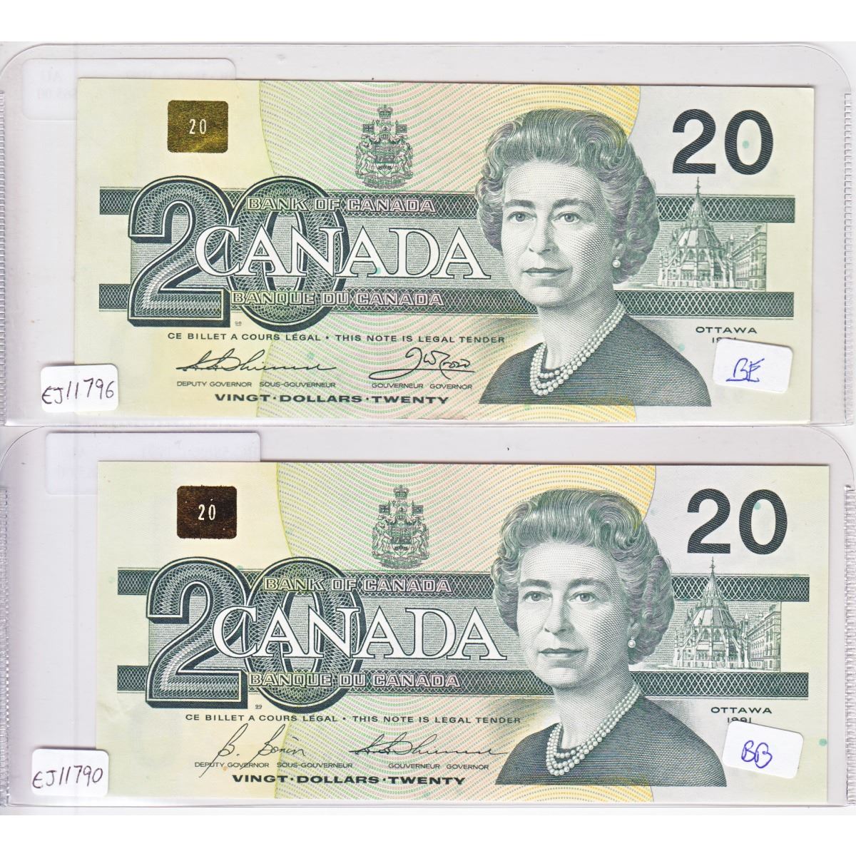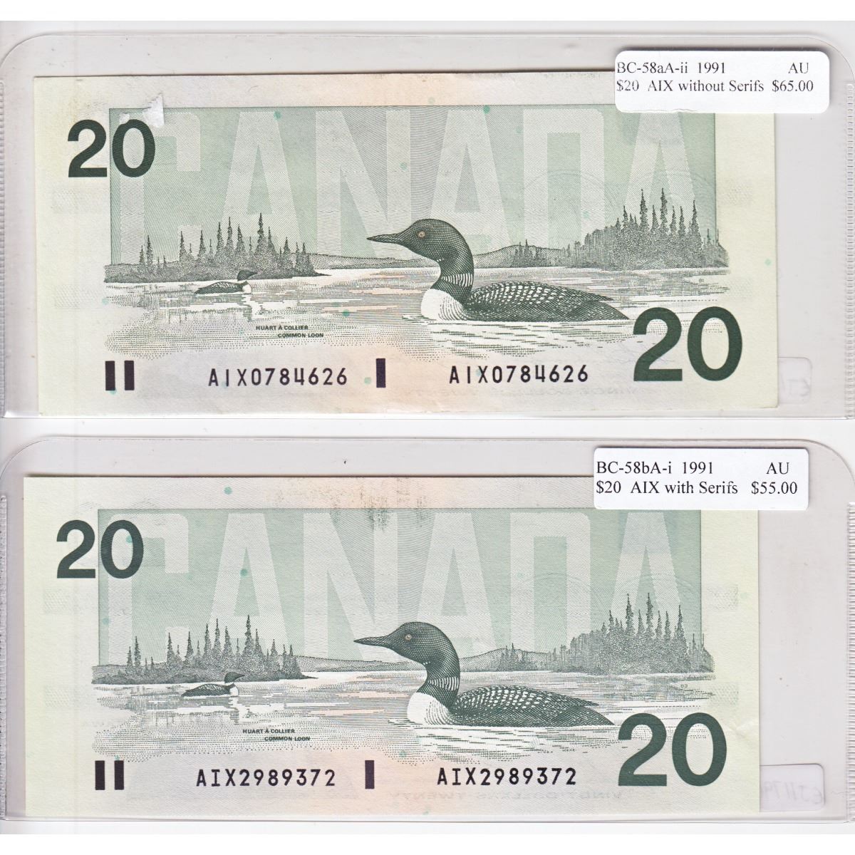 Pair of 1991 Replacement $20.00 Notes in Almost UNC Condition. You will receive an AIX without Serifs (BC-58aA-ii) and an AIX with Serifs (BC-58bA-i). Buyers Premium will be added on all items as per our terms of sale. We accept Paypal, Credit Card, E-Transfer Payments, Cheque or Money Orders (there is an additional 3% fee for using Paypal or Credit Card). All invoices will be emailed immediately following the auction, please contact us if you would like to pay by credit card or receive a new revised lower total for mailing in payment or sending an e-transfer (3% discount). All Items Are Sold "AS IS", no returns