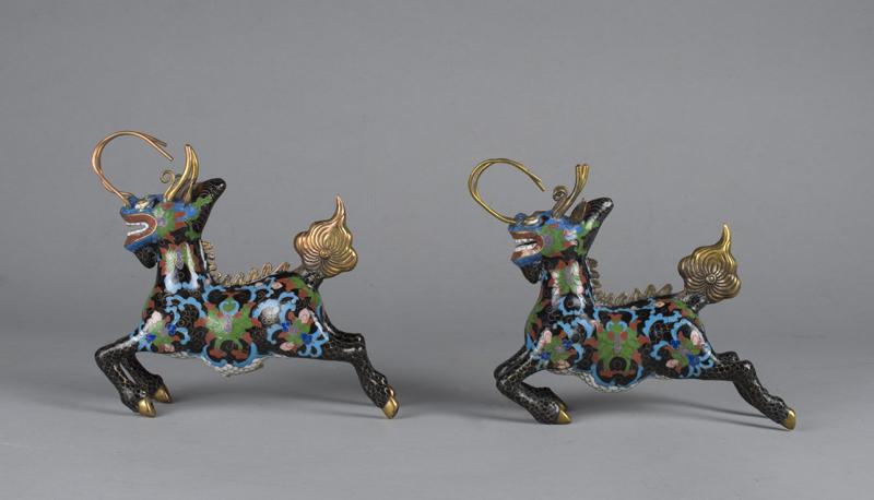 The Qilin is a mythical creature, usally portrayed with hooves like a horse, a tail like an ox, a deer body with scales in five colors and backwards antlers. It is a good omen and sometimes referred to as the "Chinese Unicorn." Both Qilin's enameled in colors of black, green, white, red, purple, yellow, pink and blues. Leaping, both are smiling, with horns, and with bronze feelers from beside their noses. Each has drilled hole in back underside. Great condition. 6.5" H x 7" L. Private collection Gross Point, Michigan.