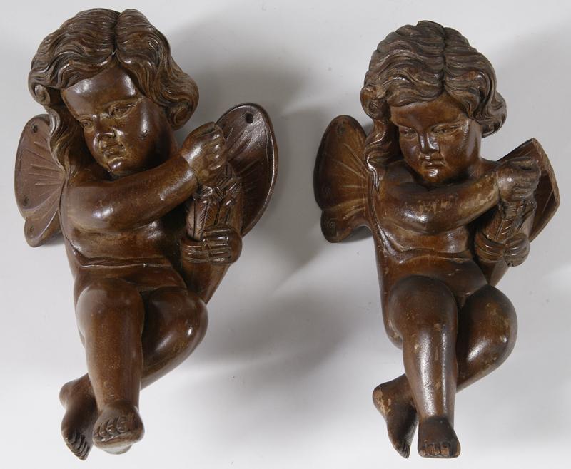 Late 19th C.  Both hand carved, each cherub holding a vase while the other hand is atop, which has a hole for a flower.  Both with original surface, and each with drilled hole in their bottoms and back where they once attached to something, and one has applied hook to back for wall hanging.  10.75" L, both have toes missing, and on has part of wing missing.  Both have normal nicks and abrasions consistent with age and use.