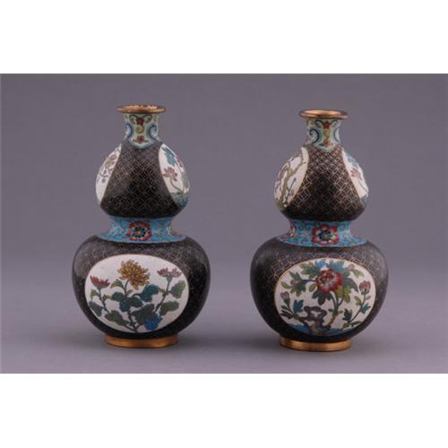 A pair of antique cloisonné vases in double- gourd shape, background with gilt coins patterns, with two large panels to neck enclosing peony, chrysanthemum, and two small panels to the neck enclosing lotus and plum flowers, both on white background. No mark in the base. Circa 19th century. Height: 8", Mouth diameter: 1 5/8" and Bottom diameter 2 7/16". Price greatly reduced due to dents on the body(see picture).