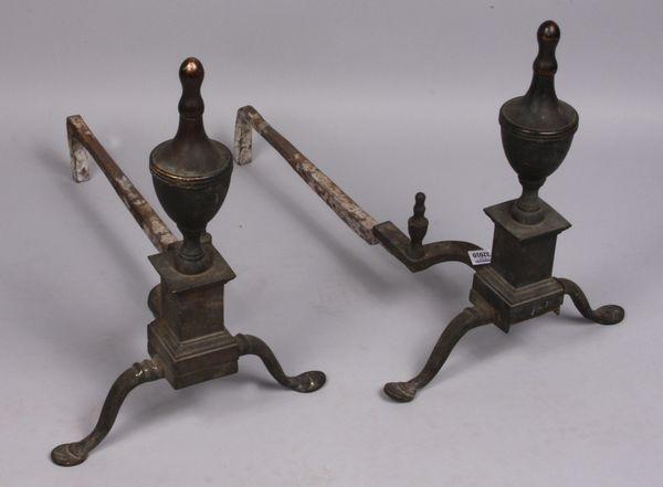 Pair of 19th Century brass andirons with penny style pad feet, 17" h.