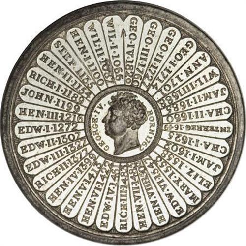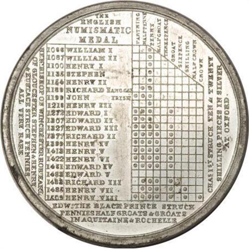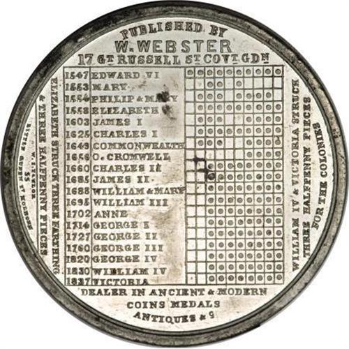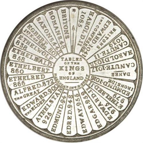 <B>Pair of 19th Century Numismatic and History Medals.</B></I> Includes: <B>1820s Halliday Kings of England Medal</B></I>, white metal, front "TABLES OF THE KINGS OF ENGLAND" in center, names and dates of British monarchs through Harold II arranged in petal-shaped slots around, back with portrait of George IV with names and dates from William to George IV, minted by credited to "HALLIDAY INV. E."; and a <B>Circa 1840s Victorian-Era W. Webster Numismatic Medal</B></I>, white metal, published by the aforementioned W. Webster, described as a "dealer in ancient & modern coins, medals, antiques &c" in an exergue, listing monarchs and the denominations they minted from William to Victoria, billed as "The English Numismatic Medal."<BR><BR><b>Shipping:</b> Coins & Currency (<a target="_blank" href="http://www.heritageauctions.com/common/shipping.php">view shipping information</a>)