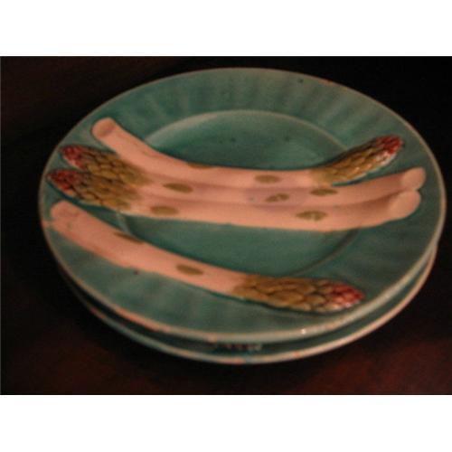 Beautiful pair of 19th century French hand-painted majolica plates with asparagus from Sarreguemine.