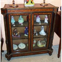 Pair of 19th Century burr wood and ebonised side cabinets having ormolu beading, each fitted two plush lined shelves flanked by glass side panels and enclosed by glass panel doors flanked by reeded and turned pillars with ormolu capitals, standing on turned bun feet, 100cms wide