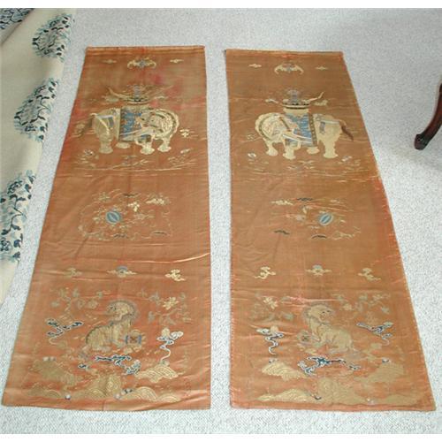 Very scare pair of Chinese silk embroidery banner with elephants and lions in gold threads. Condition is good except some wears on the silk, some loss of gold threads, and minor water stain from the backs, and minor discoloration from the water stain on the front coral silk. But still considered in good condition. Would be nicer to be protected in the frame. Would make an excellent pair of panels once they are framed.
