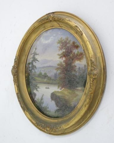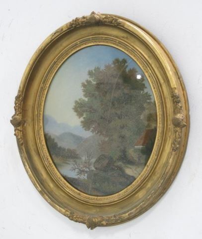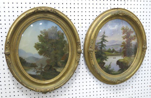In carved wood and gesso. Gilt oval frames, pastoral scenes. Image approx. 13 1/2" x 16", frame approx. 18" x 21 1/2". One glass cracked