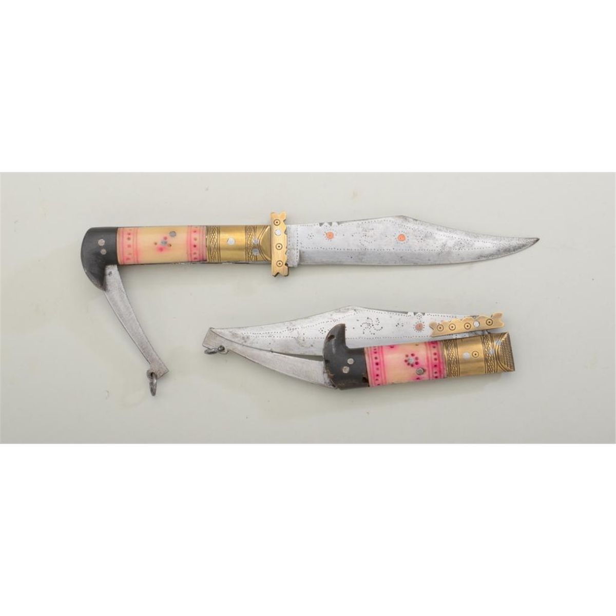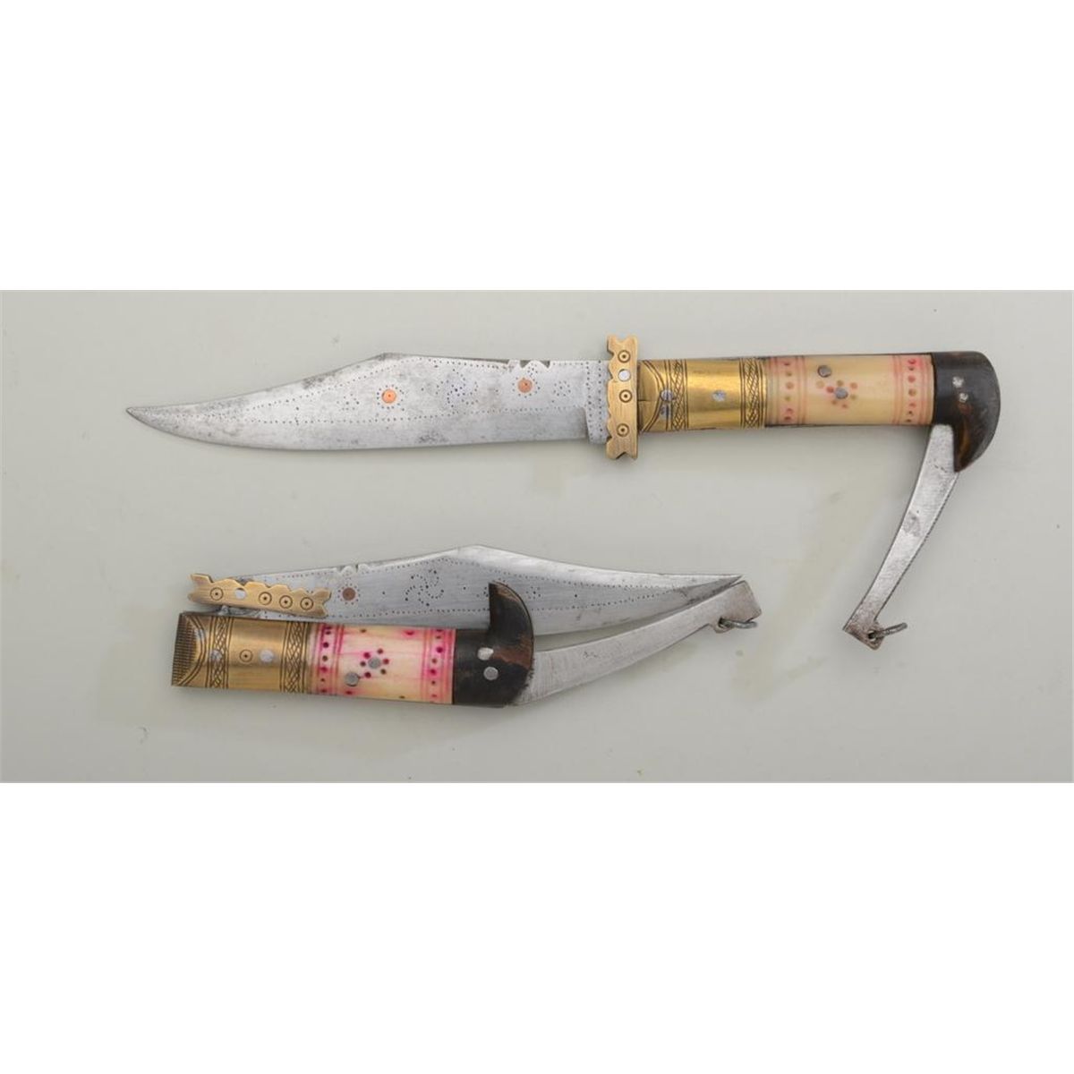 Pair of 19th century mid-eastern folding knives with bone and horn grips, near matching in style and size; first is approx. 13” overall with an approx. 6” clip point blade that shows a pierced design with twocopper inlaid discs; brass mounts and ornamented grip in generally very good to fine condition; the second knife is approx. 13” overall with an approx. 6” clip point blade that also is pierced with two copperinlaid discs, brass mounts and ornamented grip that is very similar in design with the other folder. A nice set. Est.: $400-$500.