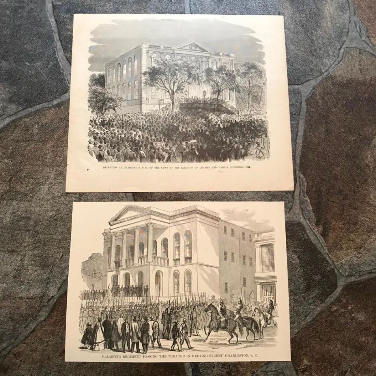 Pair of mid 19thc woodcut engravings of Charleston South Carolina. - Palmetto Regiment Passing The Theater In Meeting Street. Charleston, S.C. 7 1/2" X 1- 1/4" - Reception At Charleston, S.C., Of The News Of the Election of Lincoln & Hamlin, November, 1860. 9 1/2" X 11".