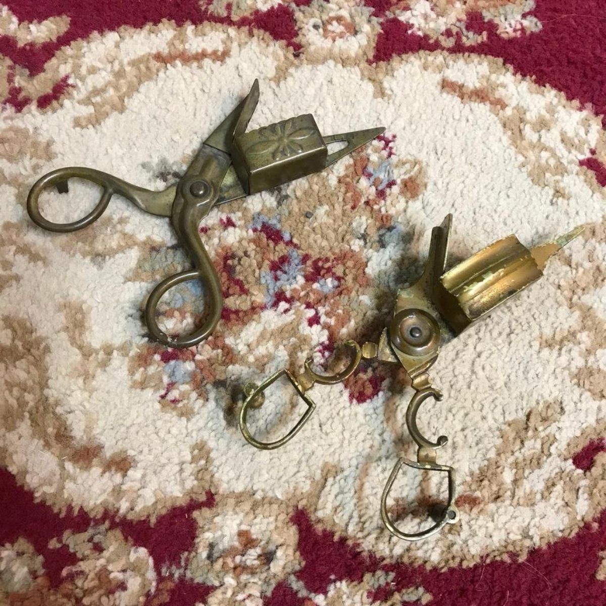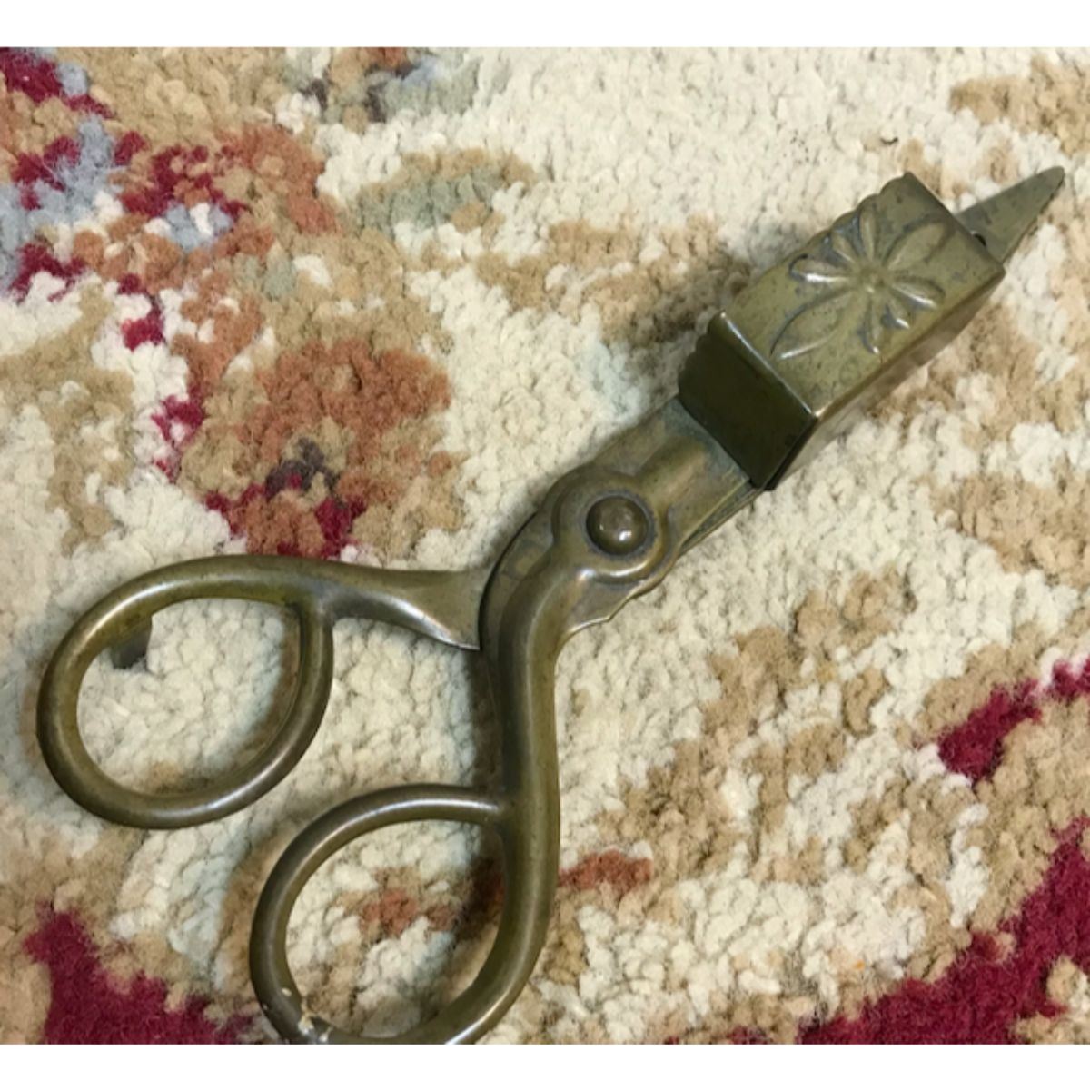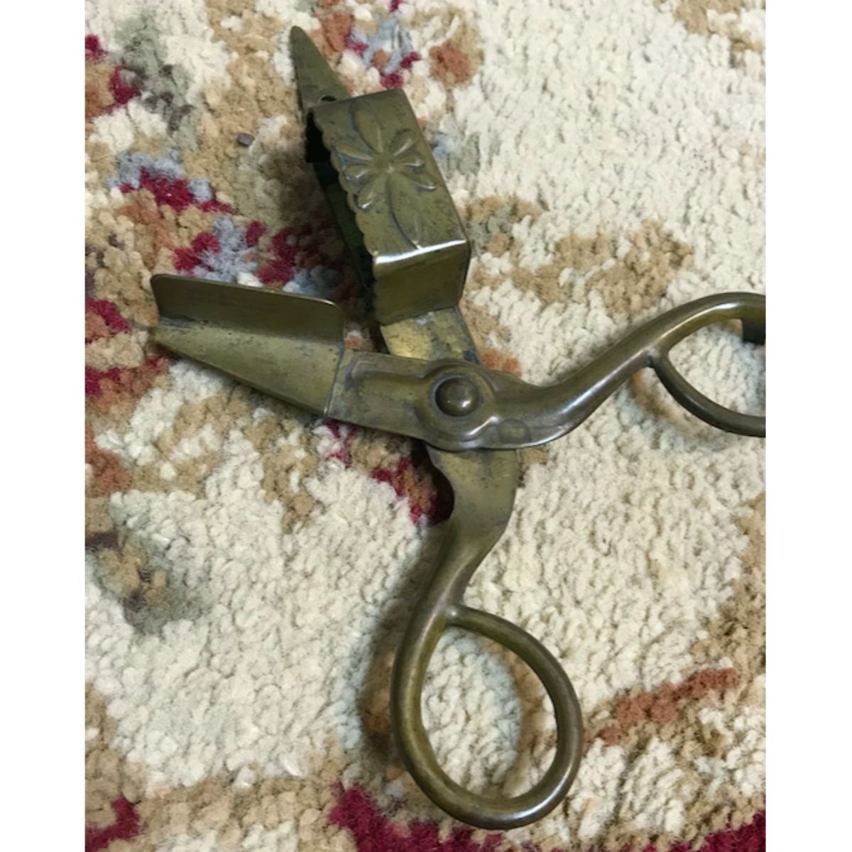 Pair of 19th Century Victorian ornate brass candlewick snippers, trimmers, snuffers. One stamped " Patented Nov 24 1857". Previously displayed within a Victorian era museum. Approx 6" L X 2 1/2" W.