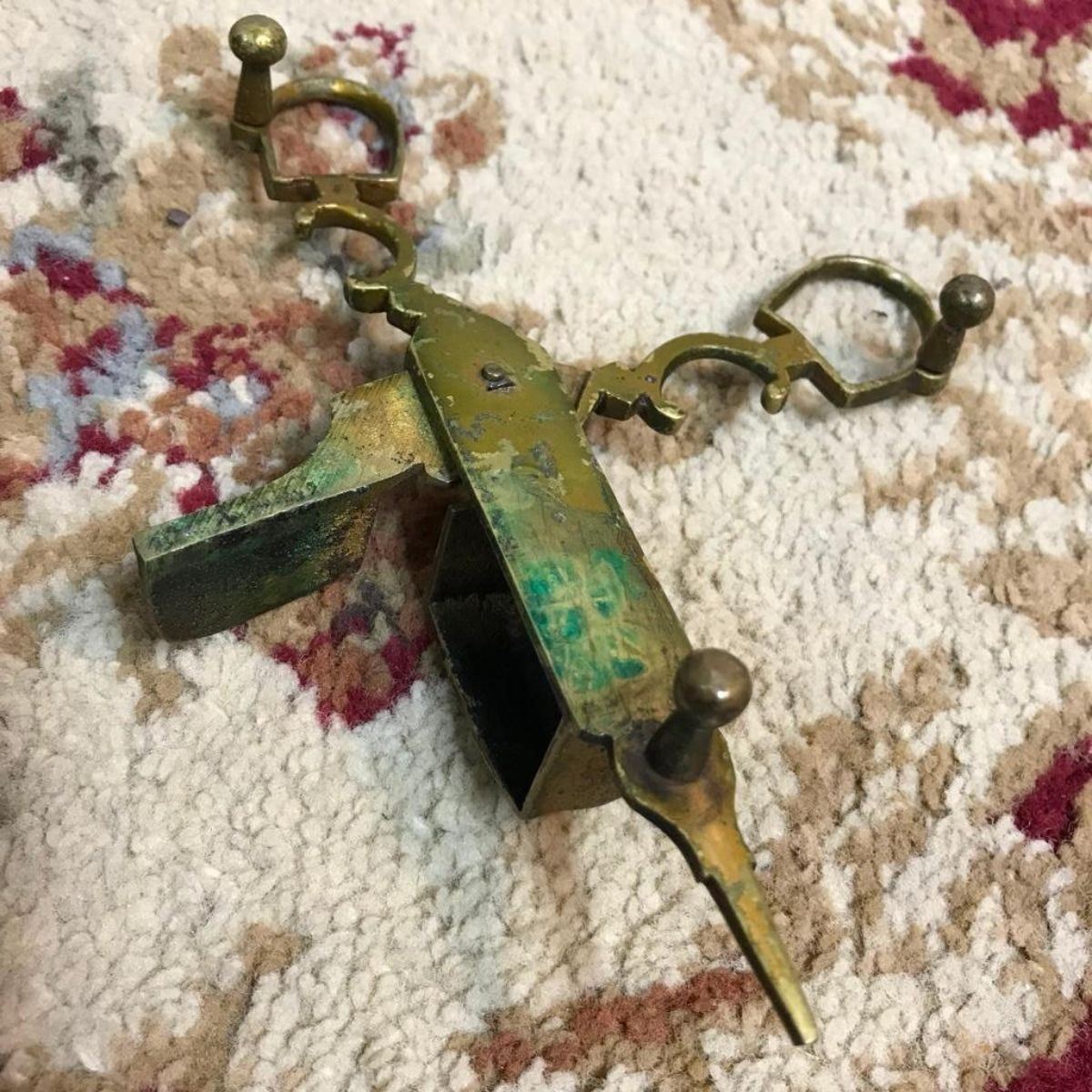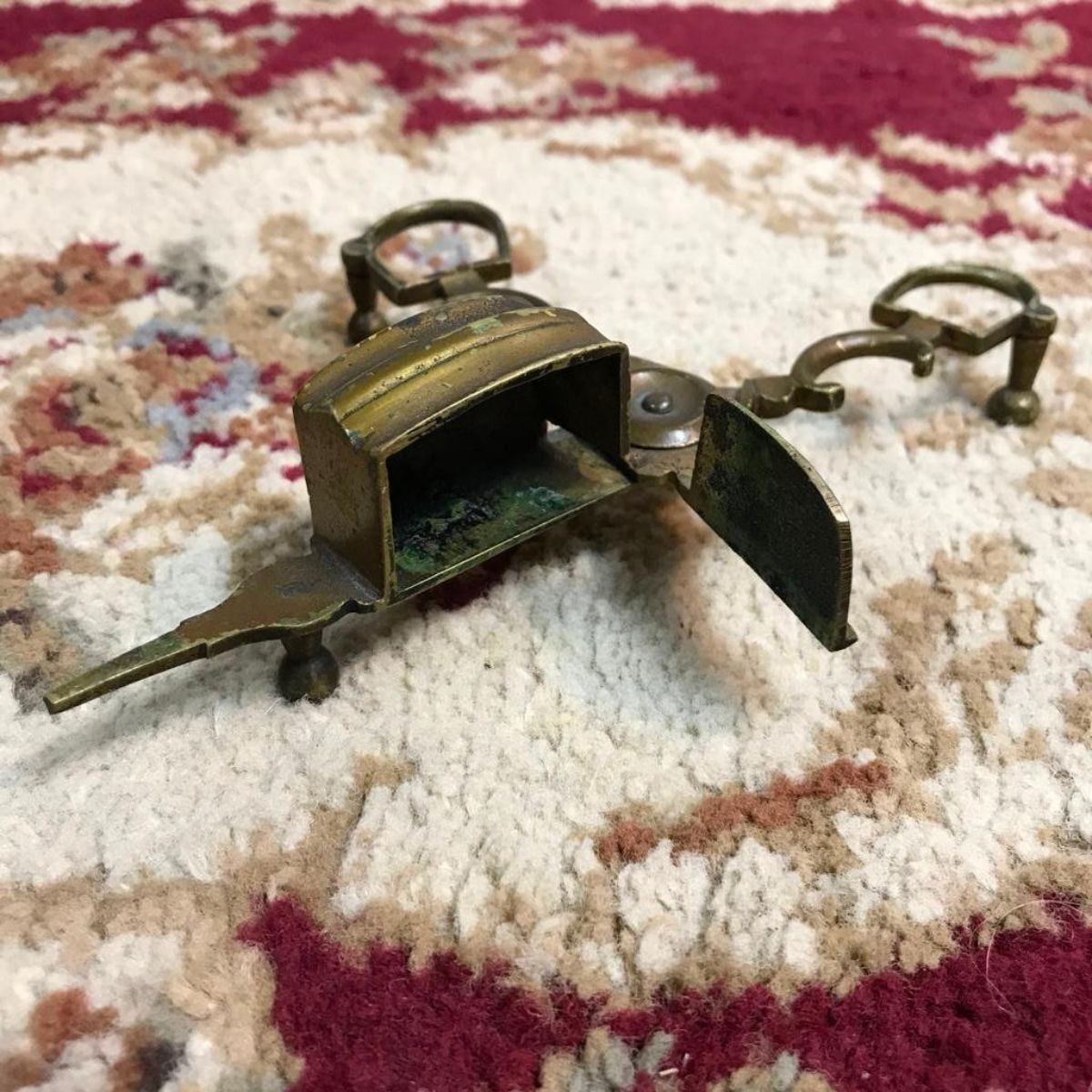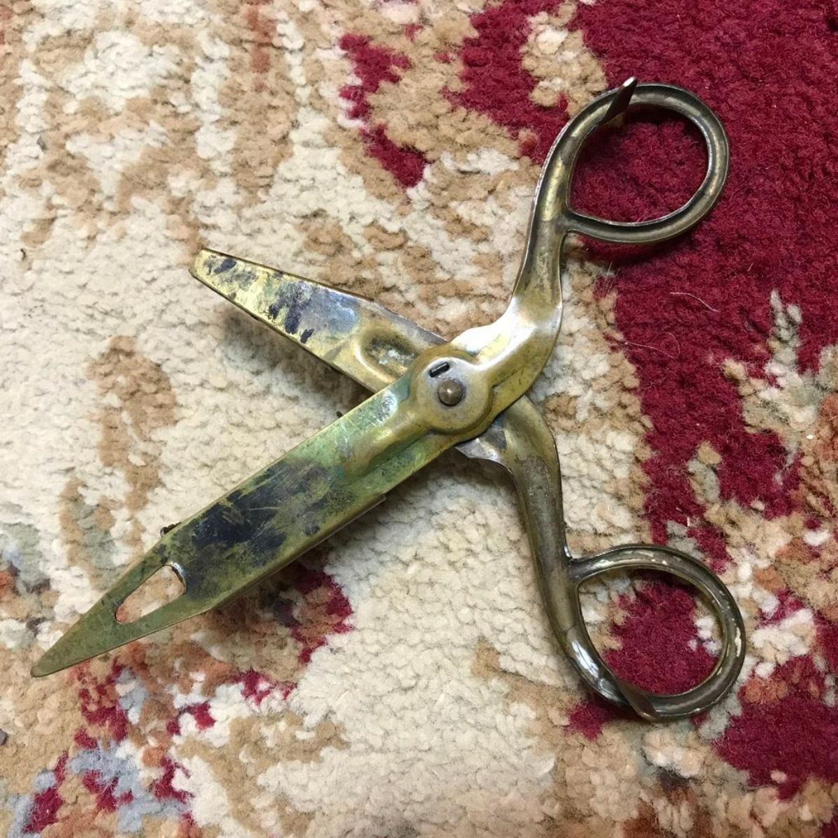 Pair of 19th Century Victorian ornate brass candlewick snippers, trimmers, snuffers. One stamped " Patented Nov 24 1857". Previously displayed within a Victorian era museum. Approx 6" L X 2 1/2" W.