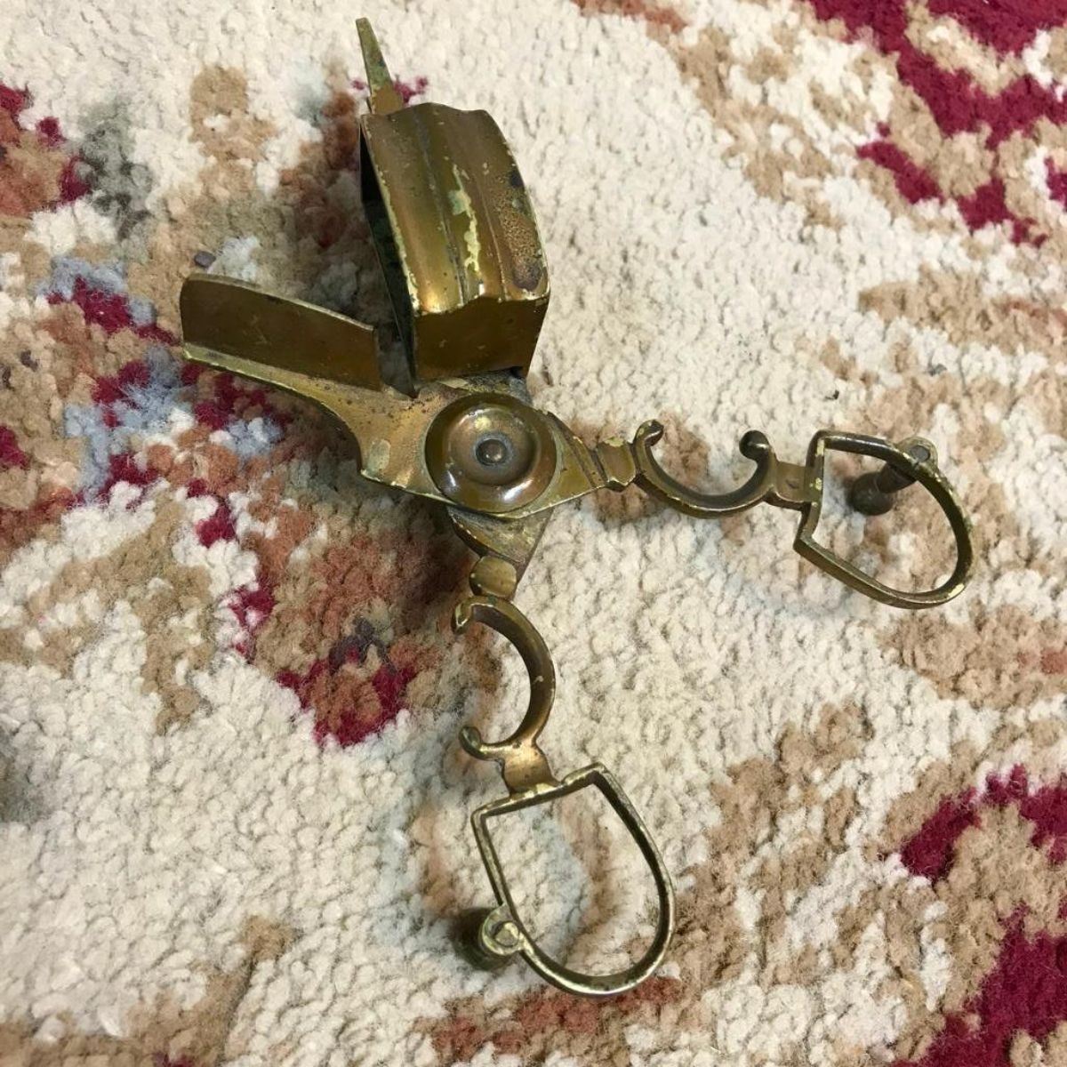 Pair of 19th Century Victorian ornate brass candlewick snippers, trimmers, snuffers. One stamped " Patented Nov 24 1857". Previously displayed within a Victorian-era museum. Approx 6" L X 2 1/2" W.