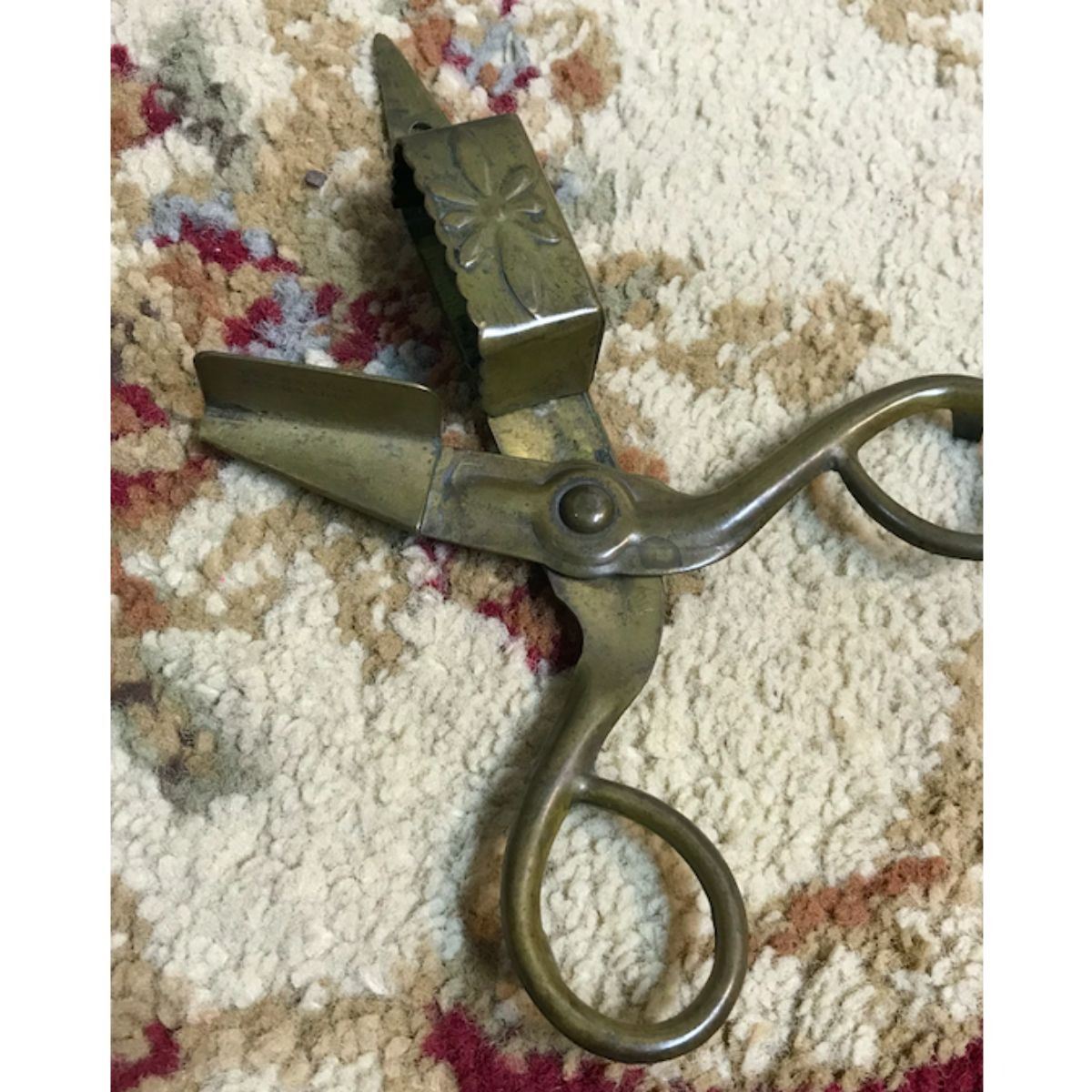 Pair of 19th Century Victorian ornate brass candlewick snippers, trimmers, snuffers. One stamped " Patented Nov 24 1857". Previously displayed within a Victorian-era museum. Approx 6" L X 2 1/2" W.