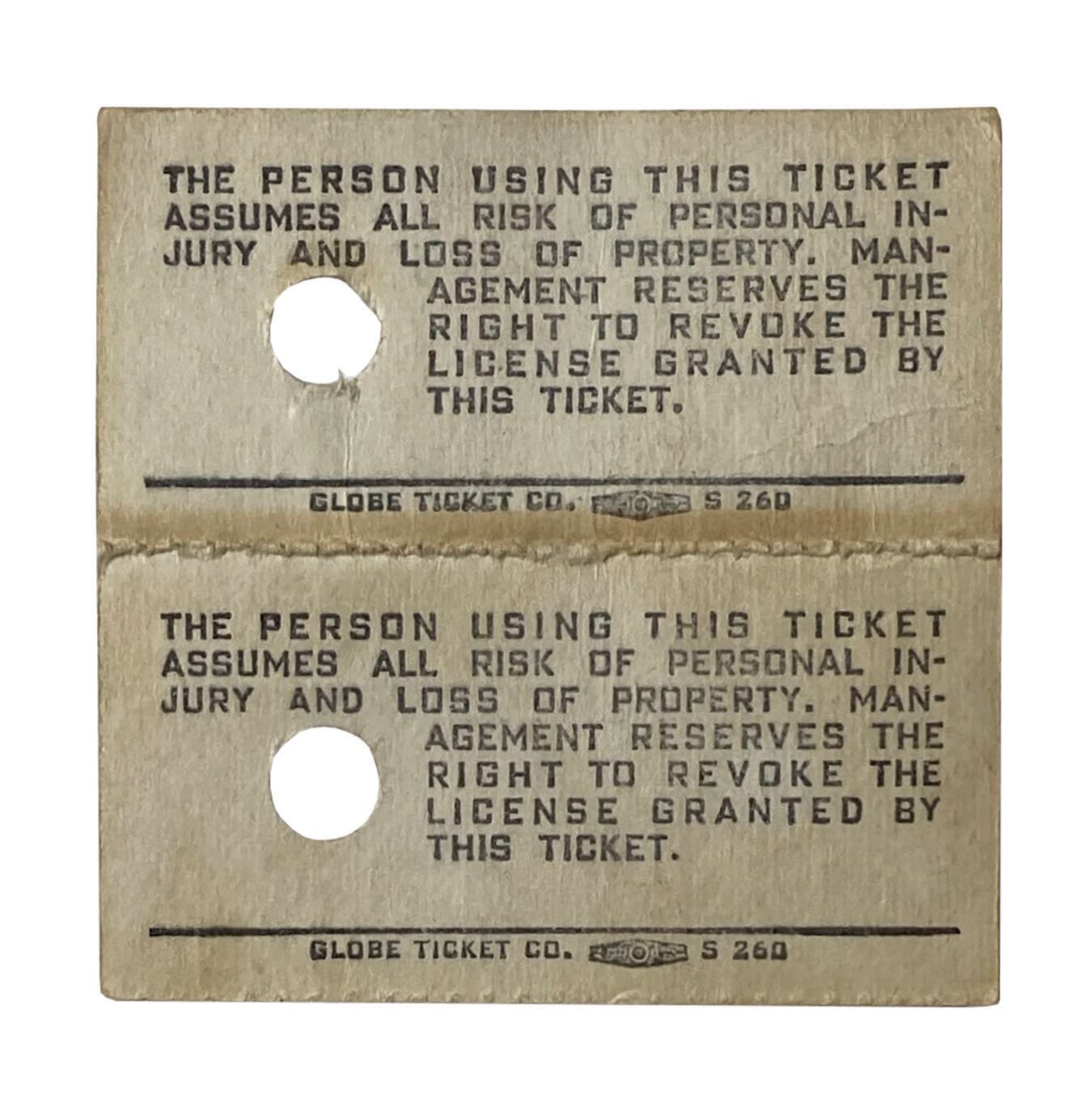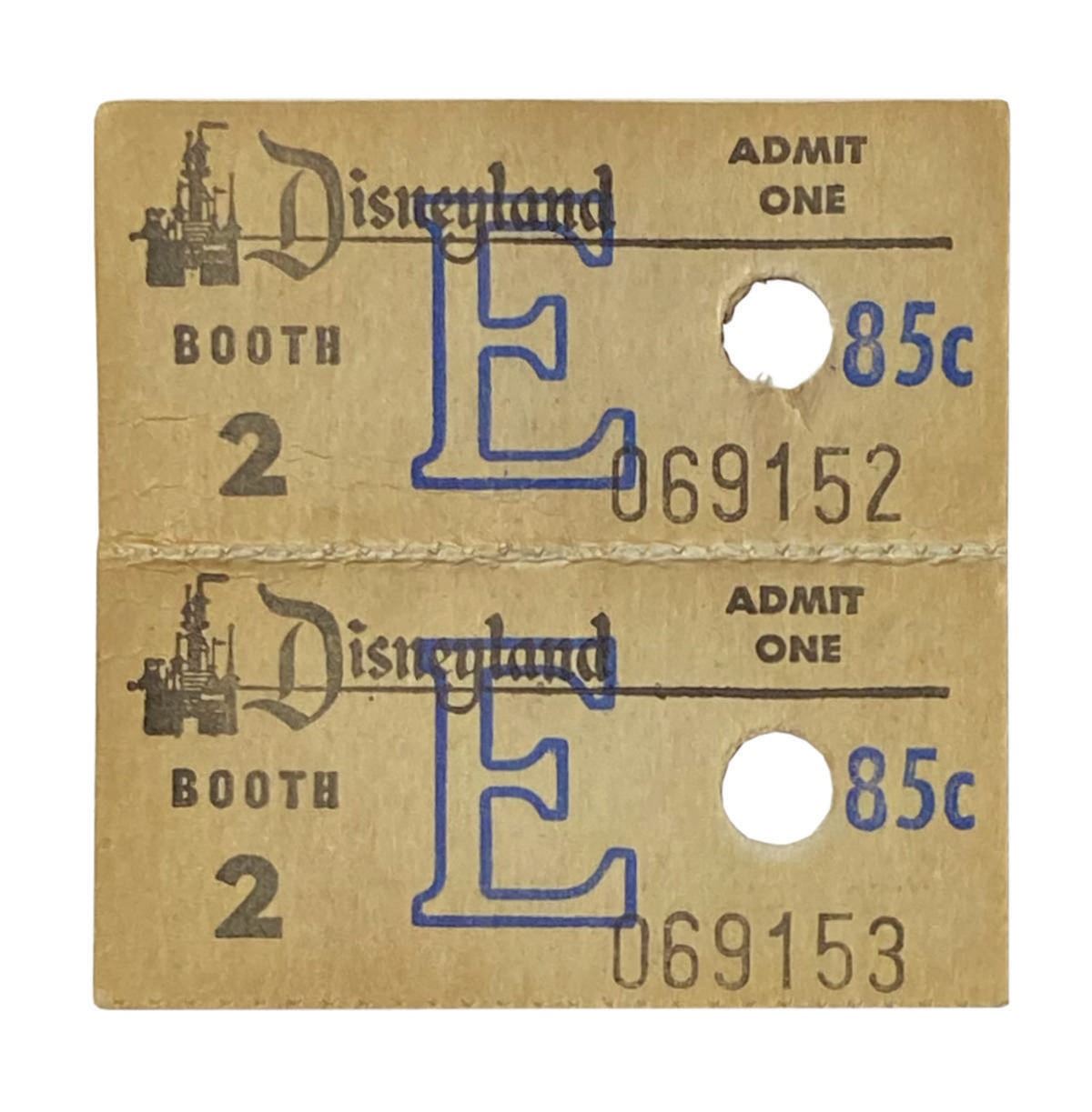 (Disneyland, c.1970s) A pair of Disneyland E Tickets with a face value of 85 cents. Purchased at Booth 2, the E Tickets are connected with an unbroken line of perforation, and have a single punch-hole at right. They measure a combined 2"x2". In very good condition, the pair exhibits tan toning around the edges and the perforation line the reverse.