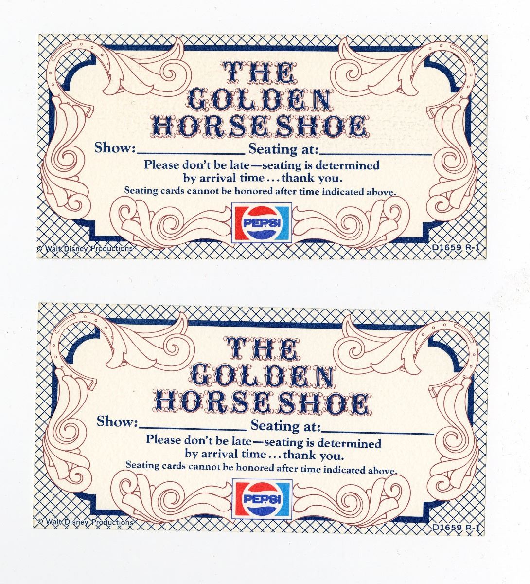 (Disneyland, 1970s) These "Golden Horseshoe Revue" tickets feature the Pepsi logo at the bottom of each ticket. These tickets have not been filled in with show or seating information. Measure 2.5"x5" each. In good condition.