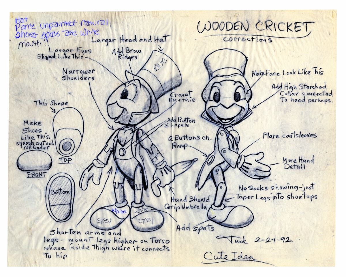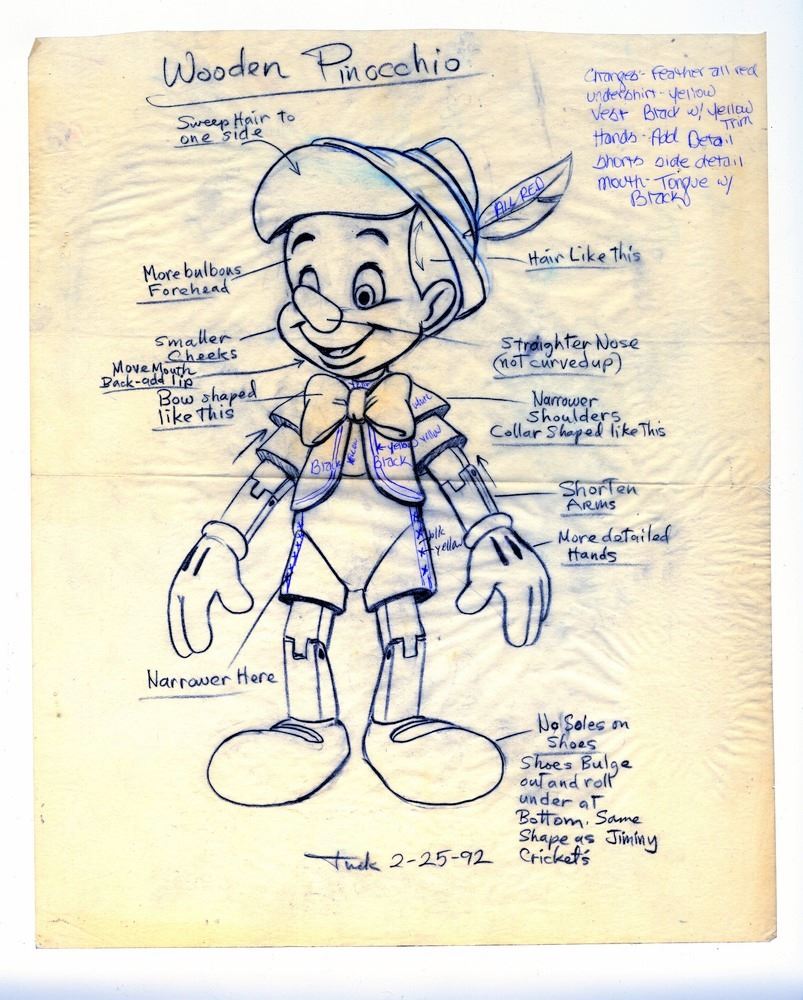(Disneyland, 1994) Beautiful pair of hand-carved Pinocchio and Jiminy Cricket figures created for a 1000-piece limited edition to be sold at Disneyland in the 1990s. This pair is an Artist's Proof, hand-carved out of solid mahogany with pine face and hands. These figures come with (2) original development drawings and (2) photostat sheets used in the creation of the figures. The Pinocchio figure measures 9.5" tall and Jiminy measures 6" tall. Pair is in good condition with minor wear.