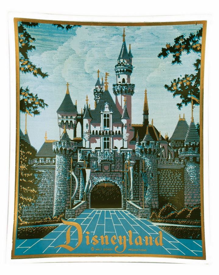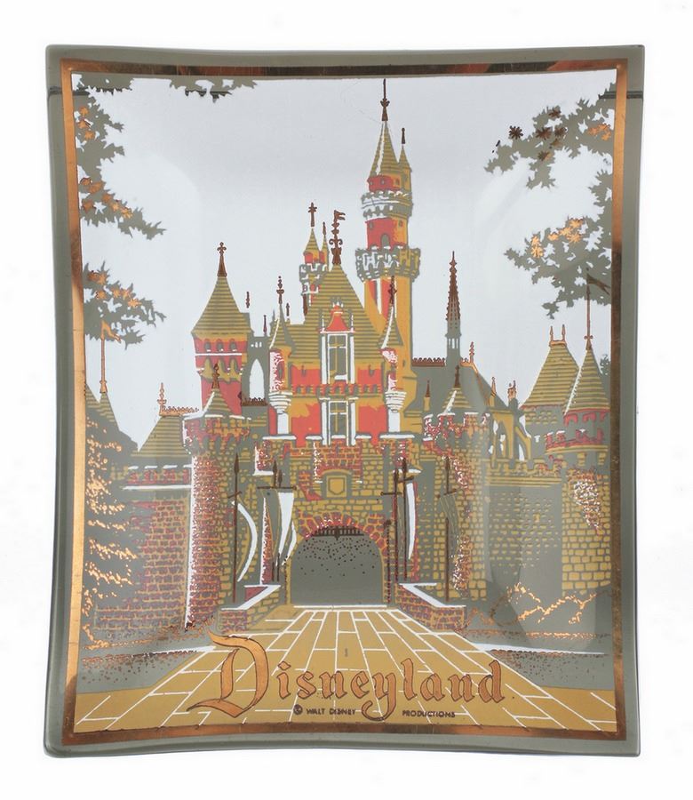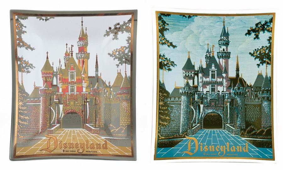 (Disneyland, 1970s) Pair of (2) smoked-glass Disneyland trays with Sleeping Beauty Castle imagery on the surface with a gold trim. Measure 4.75"x4" and 0.5" tall, each. Pair is in good condition.