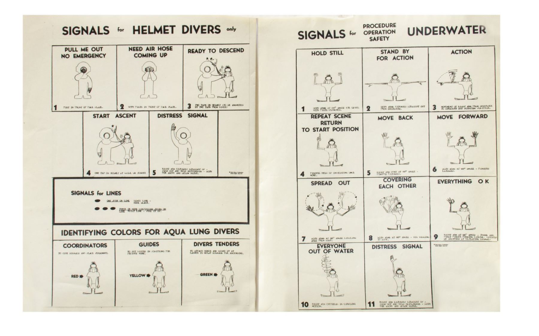 (Disney, c.1953) A very rare pair of photostatically printed safety signal sheets from the collection of Harper Goff that were used during the production of Walt Disney's "20,000 Leagues Under the Sea". The two sheets are titled "Signals for Helmet Divers Only" and "Signals for Procedure Operation Safety Underwater", and feature images of the helmeted divers and regular divers, respectively. The back sides of the sheets have hand-written Disney Studio coding which appears to date these sheets to December of 1953. Measuring 11"x8.5" each, the sheets are in good condition overall with some edge-wear throughout from use.