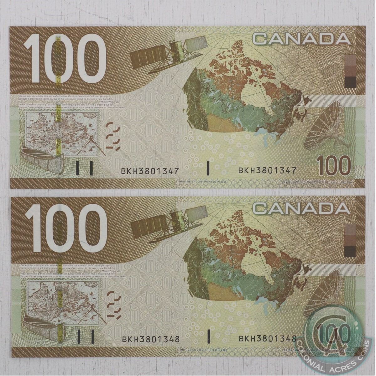 Pair of 2004 Canada $100.00 notes with consecutive serial numbers both in UNC Condition