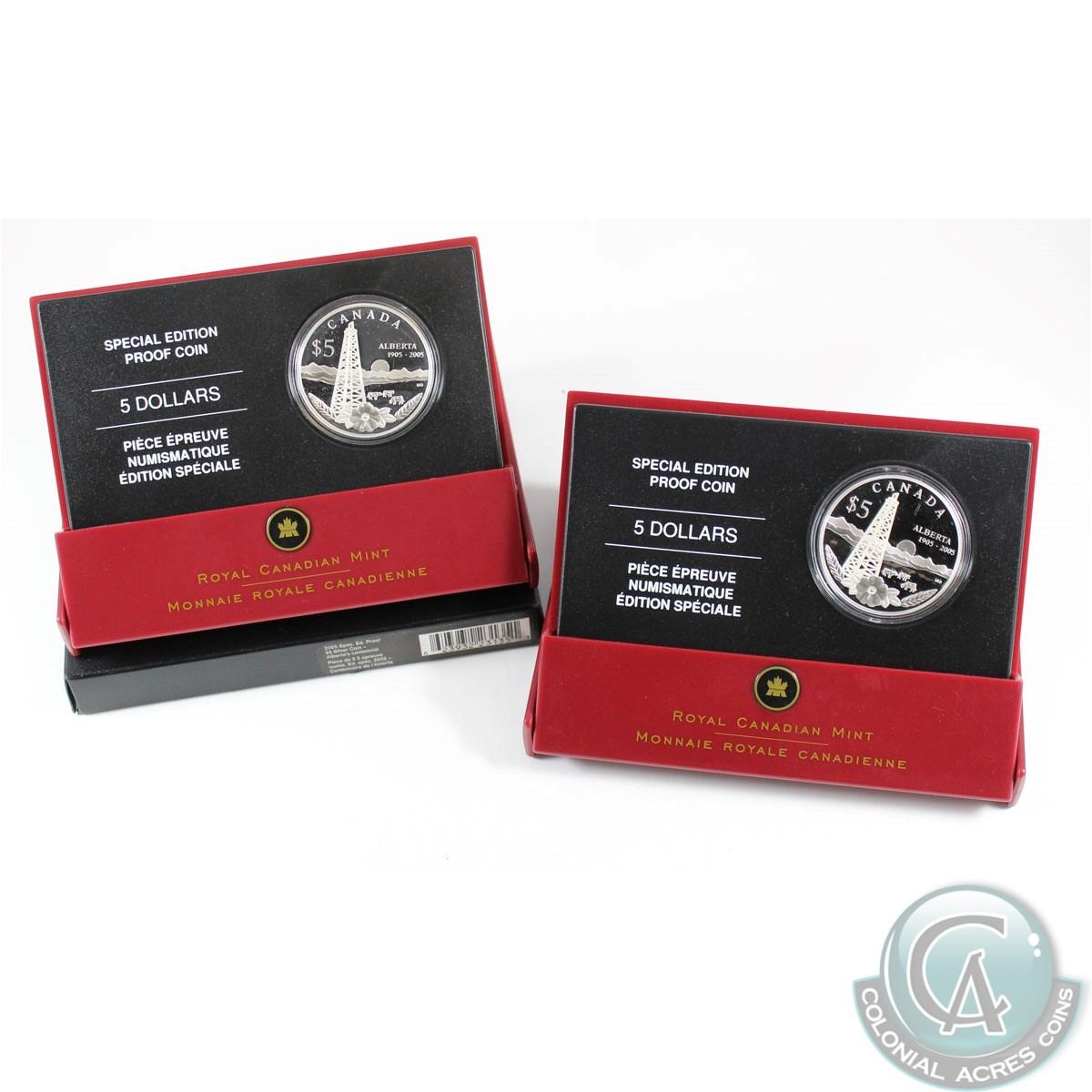Pair of 2005 Canada $5 Alberta's Centennial Special Edition Silver Coins (Tax Exempt). Please note one coin is missing the outer box and capule has faint scratches. 2pcs.