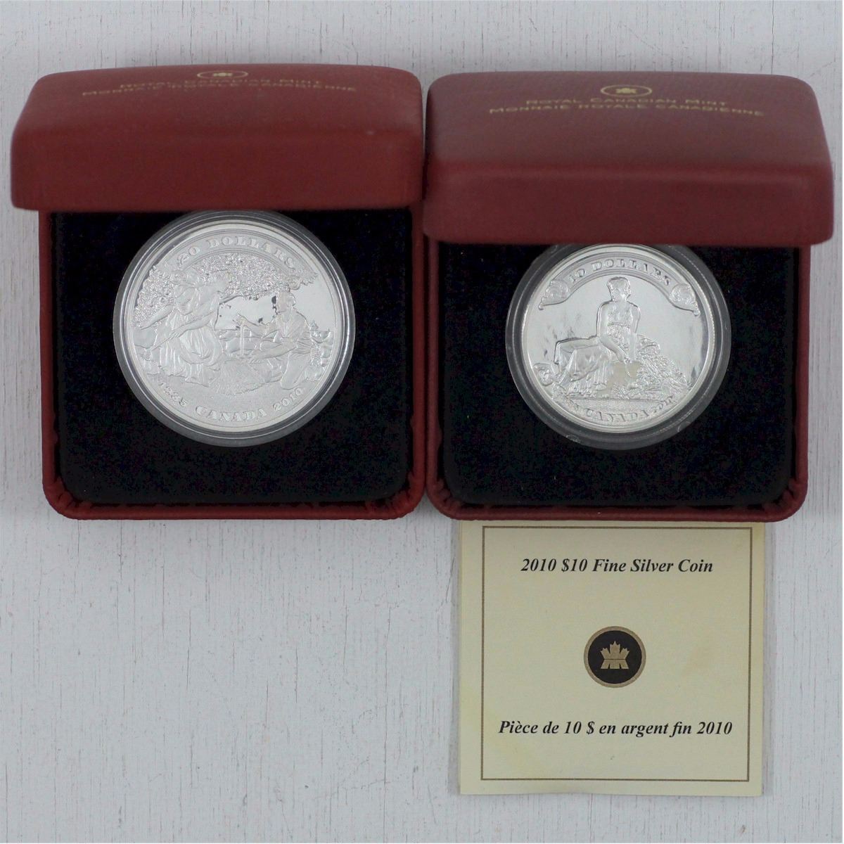 Pair of 2010 $10 and $20 Fine Silver 75th Anniversary Of the First Bank Notes Issued by the Bank of Canada coin. (Tax Exempt). Coins come encapsulated with Display Box. Buyers Premium will be added on all items as per our terms of sale. We accept Paypal, Credit Card, E-Transfer Payments, Cheque or Money Orders (there is an additional 3% fee for using Paypal or Credit Card). All invoices will be emailed immediately following the auction, please contact us if you would like to pay by credit card or receive a new revised lower total for mailing in payment or sending an e-transfer (3% discount). All Items Are Sold "AS IS", no returns