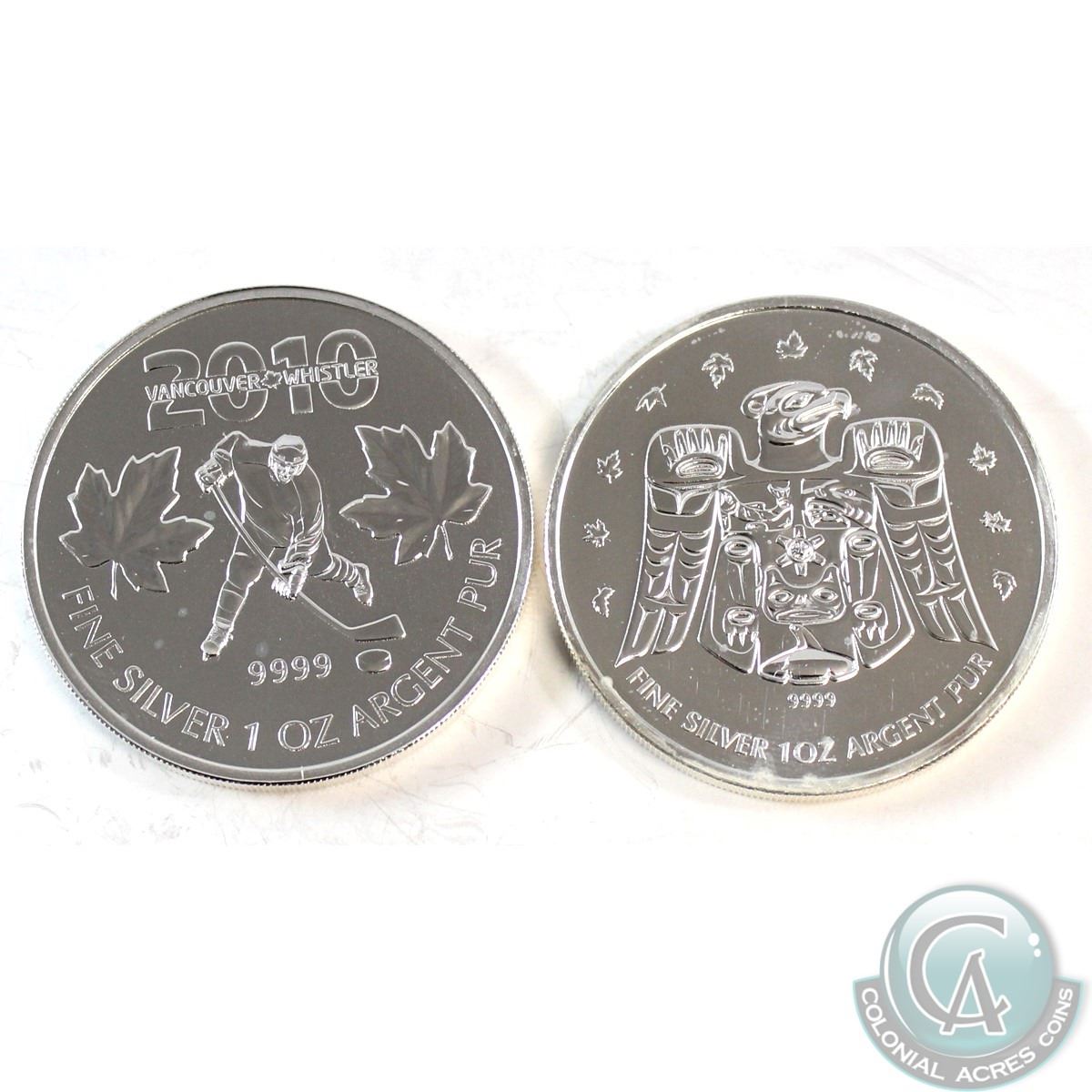 Pair of 2010 Vancouver Olympic $5 .9999 Fine Commemorative Silver Maple Leafs - 2009 Raven & 2010 Hockey (Coins lightly toned). 2pcs (TAX Exempt)