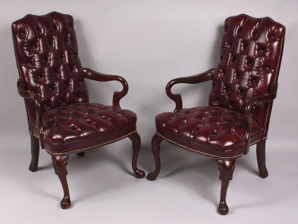 Pair of 20th Century burgundy tufted back mahogany armchairs, 42" h. Good condition.