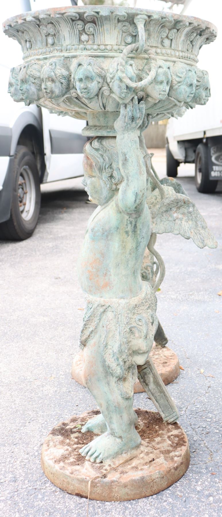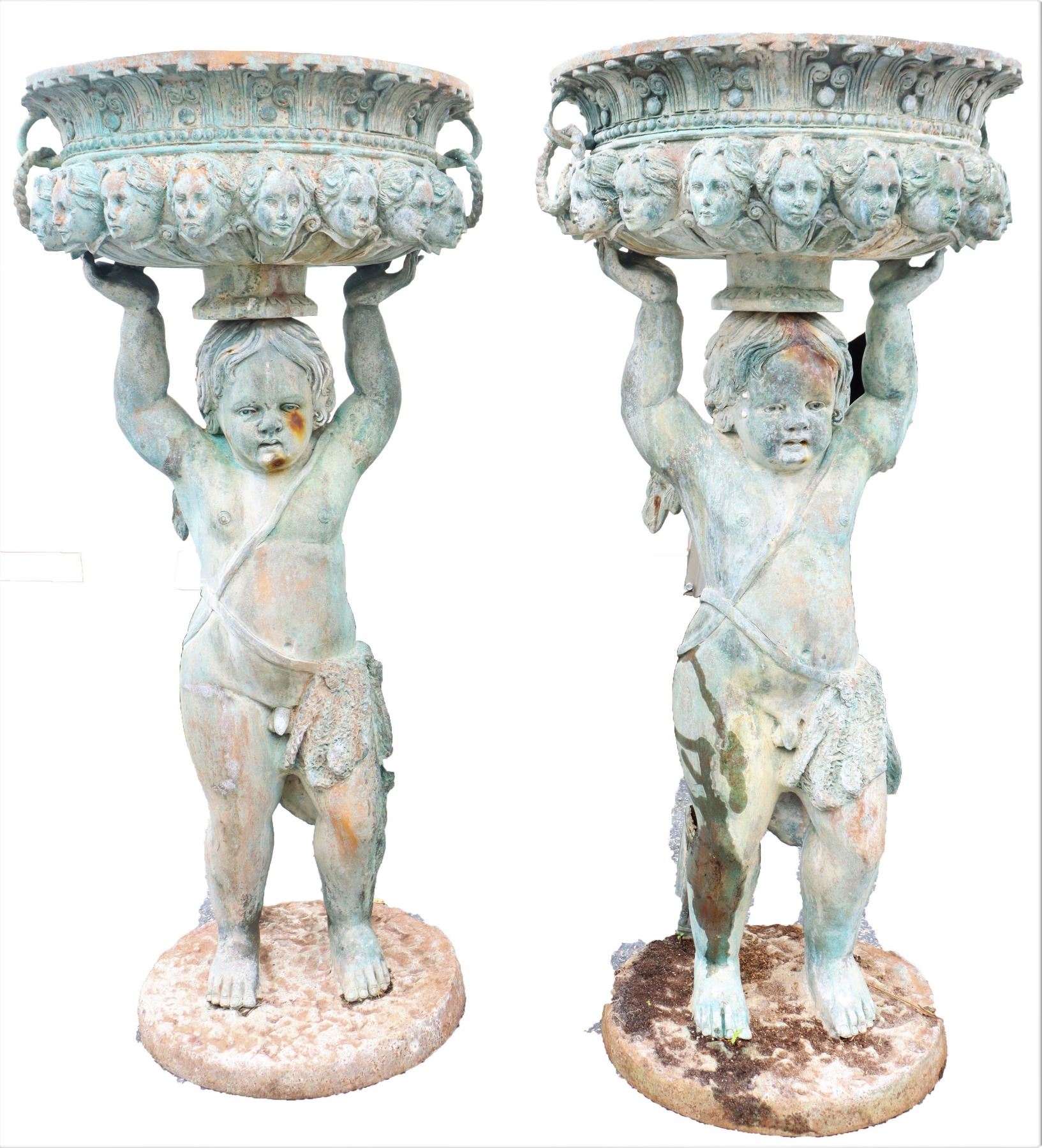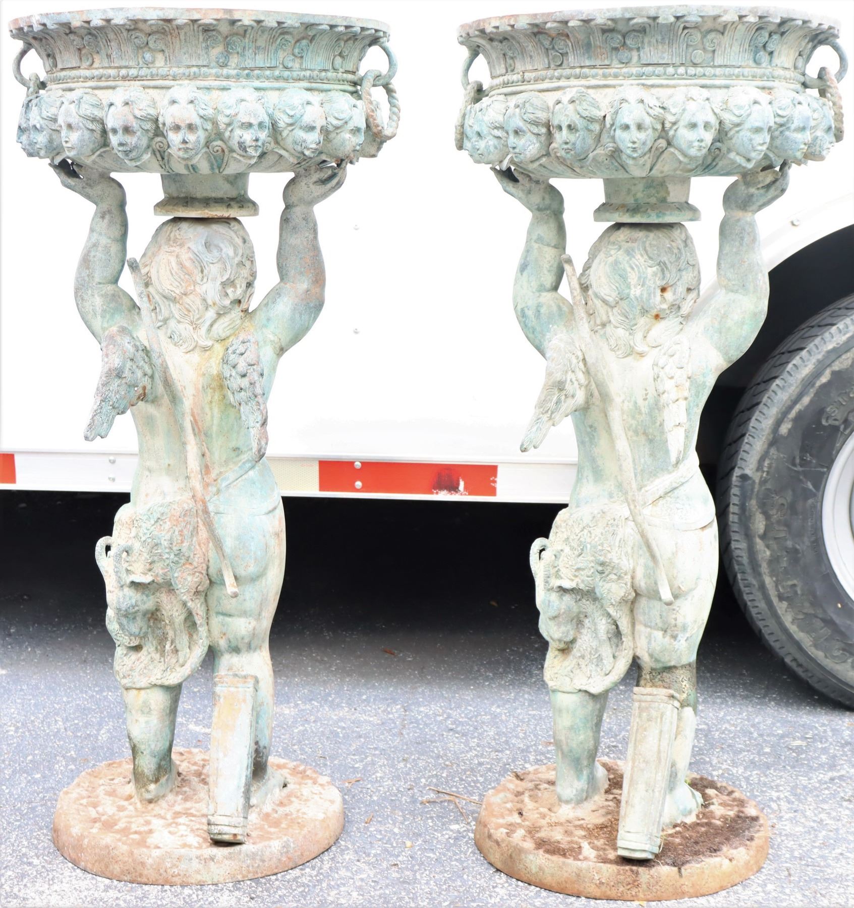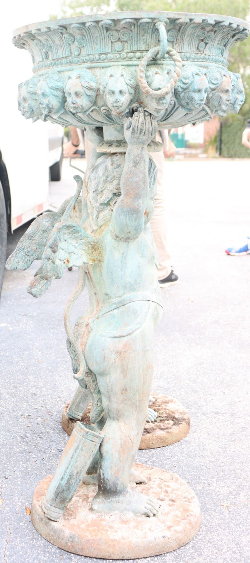 Two angel figures, or putti, holding planters, likely made of concrete. Condition commensurate with age.