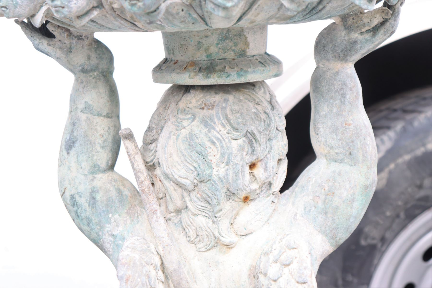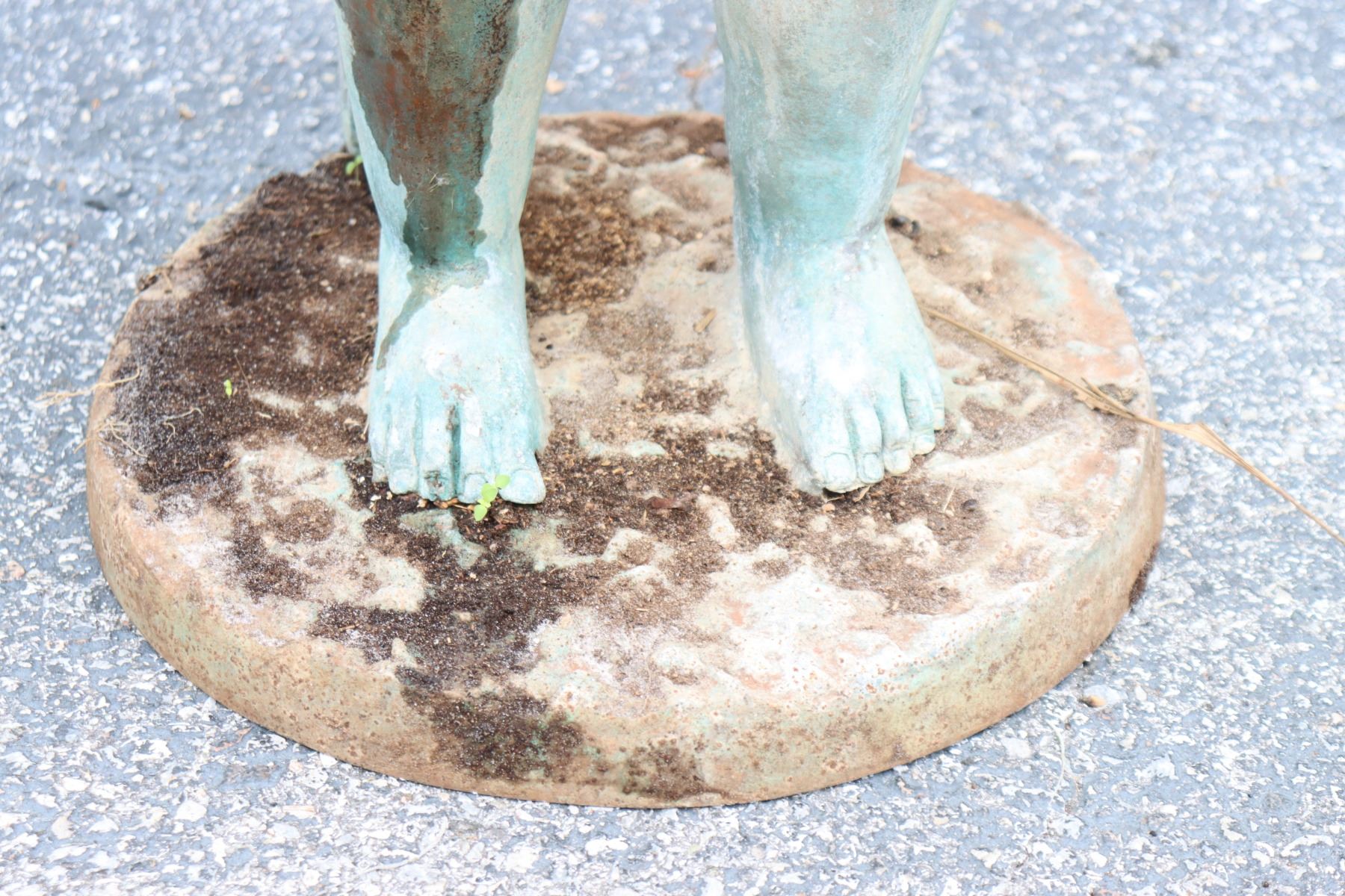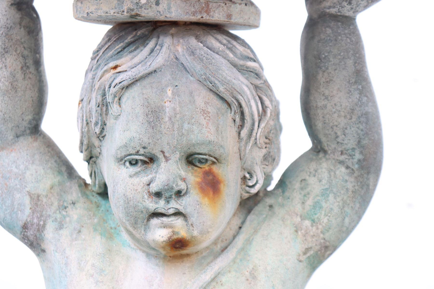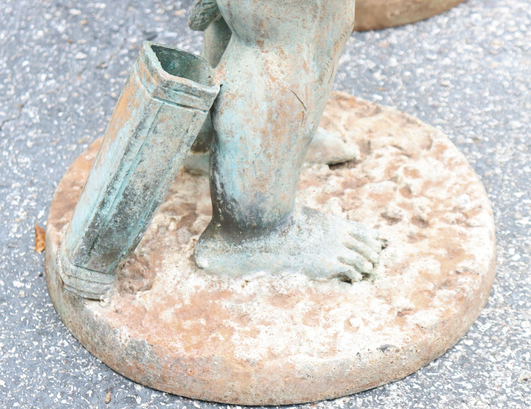 Two angel figures, or putti, holding planters, likely made of concrete. Condition commensurate with age.