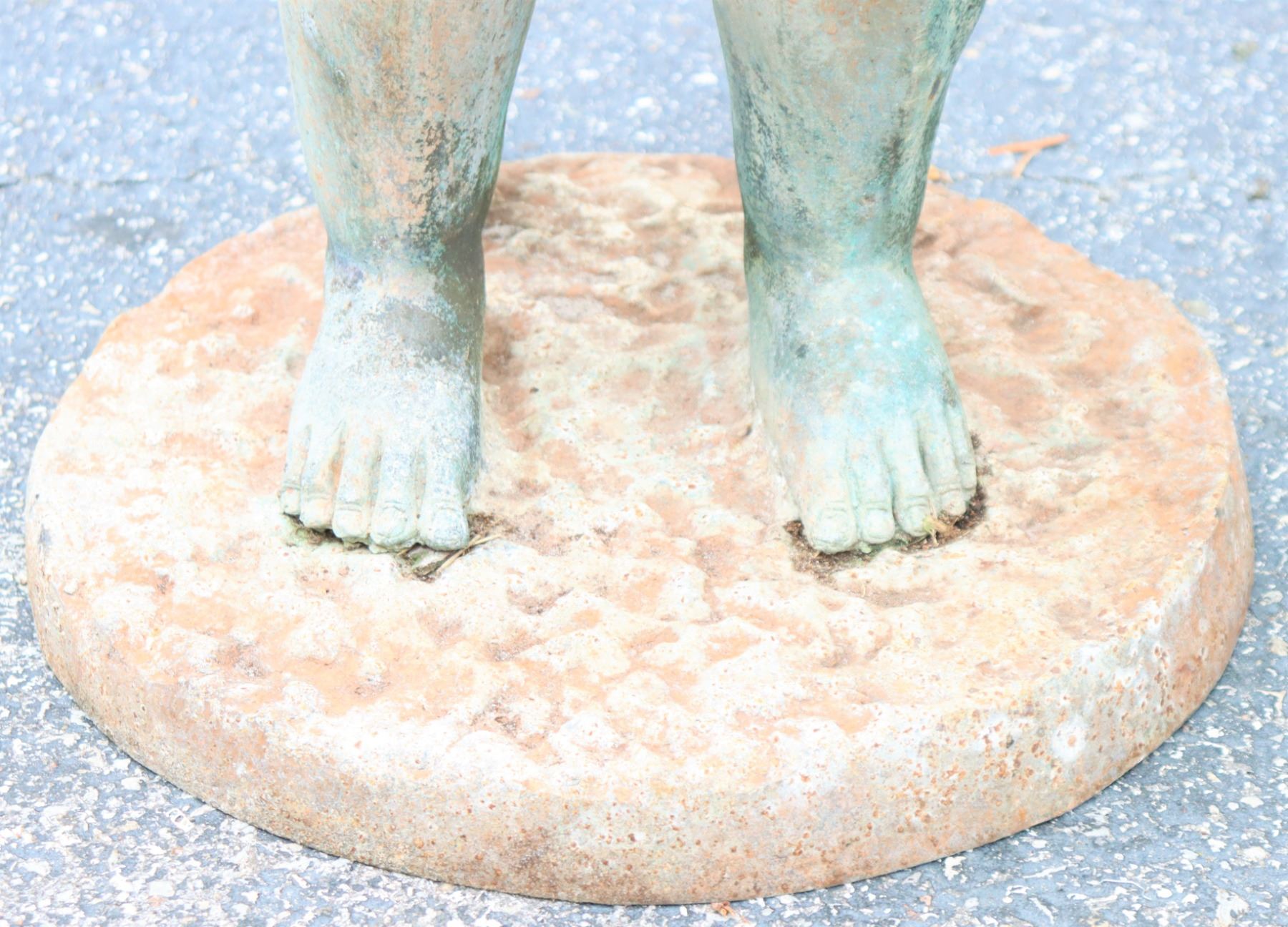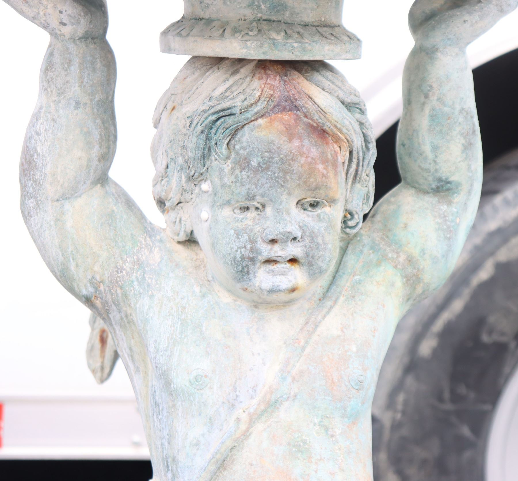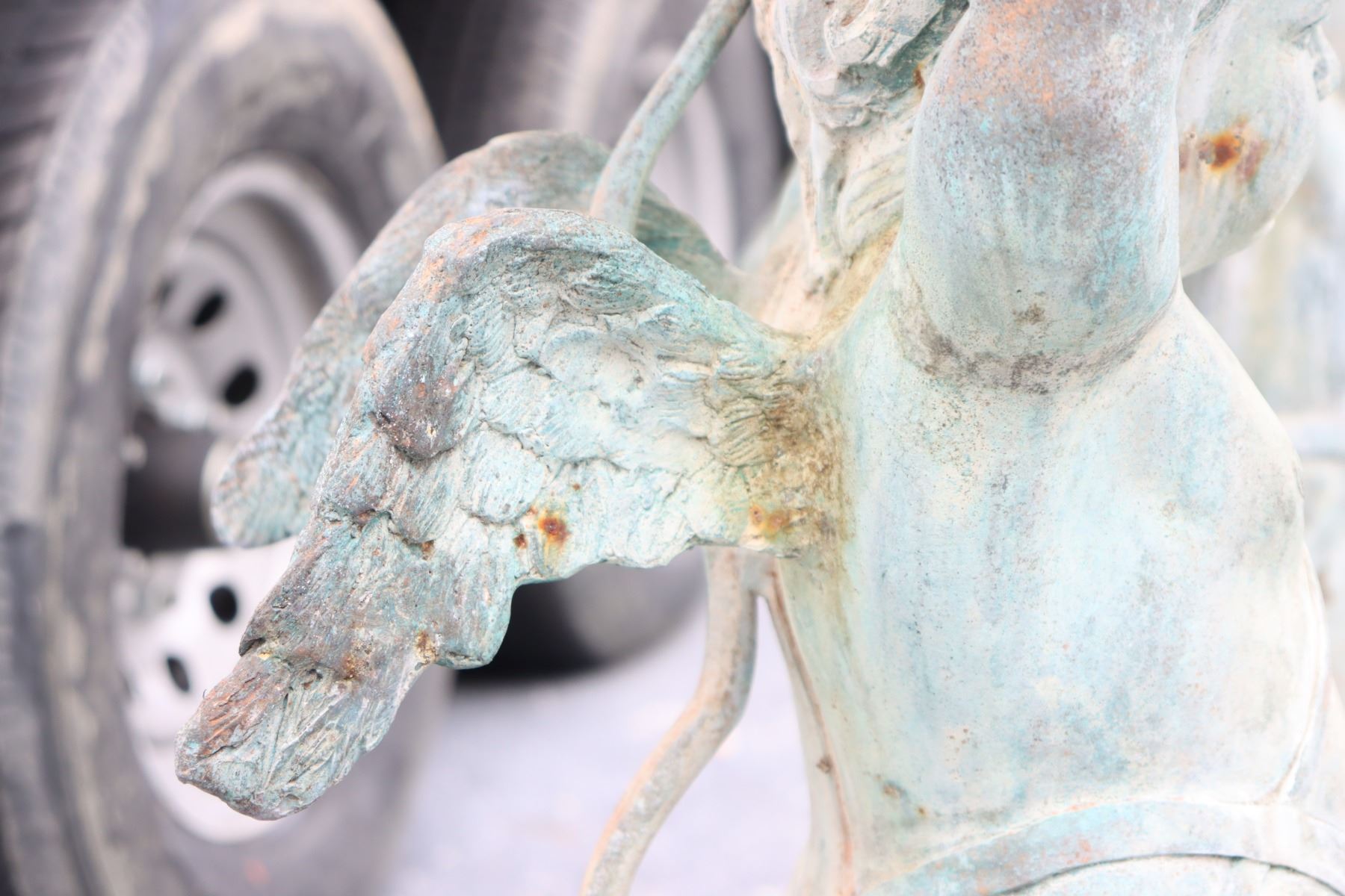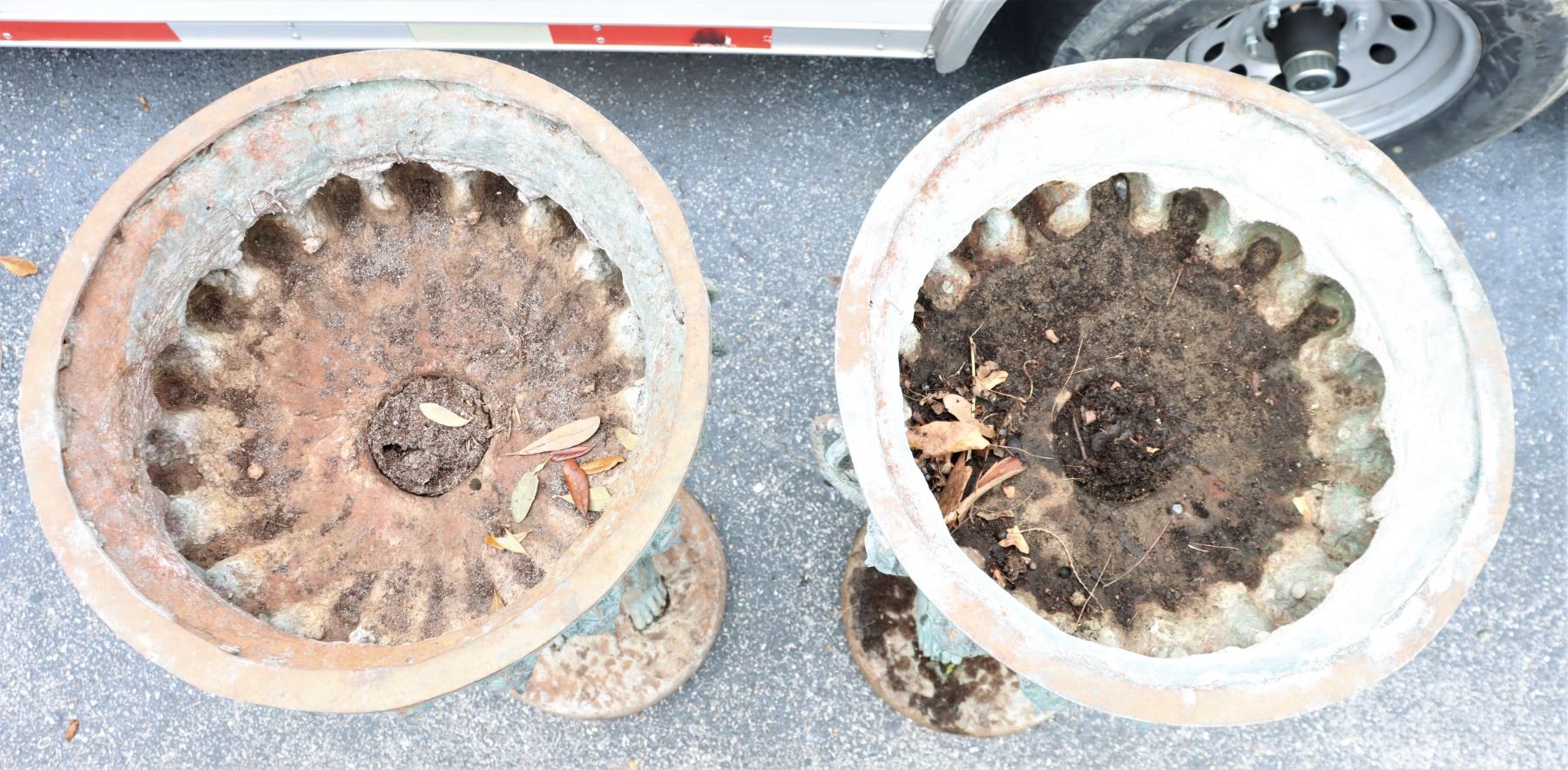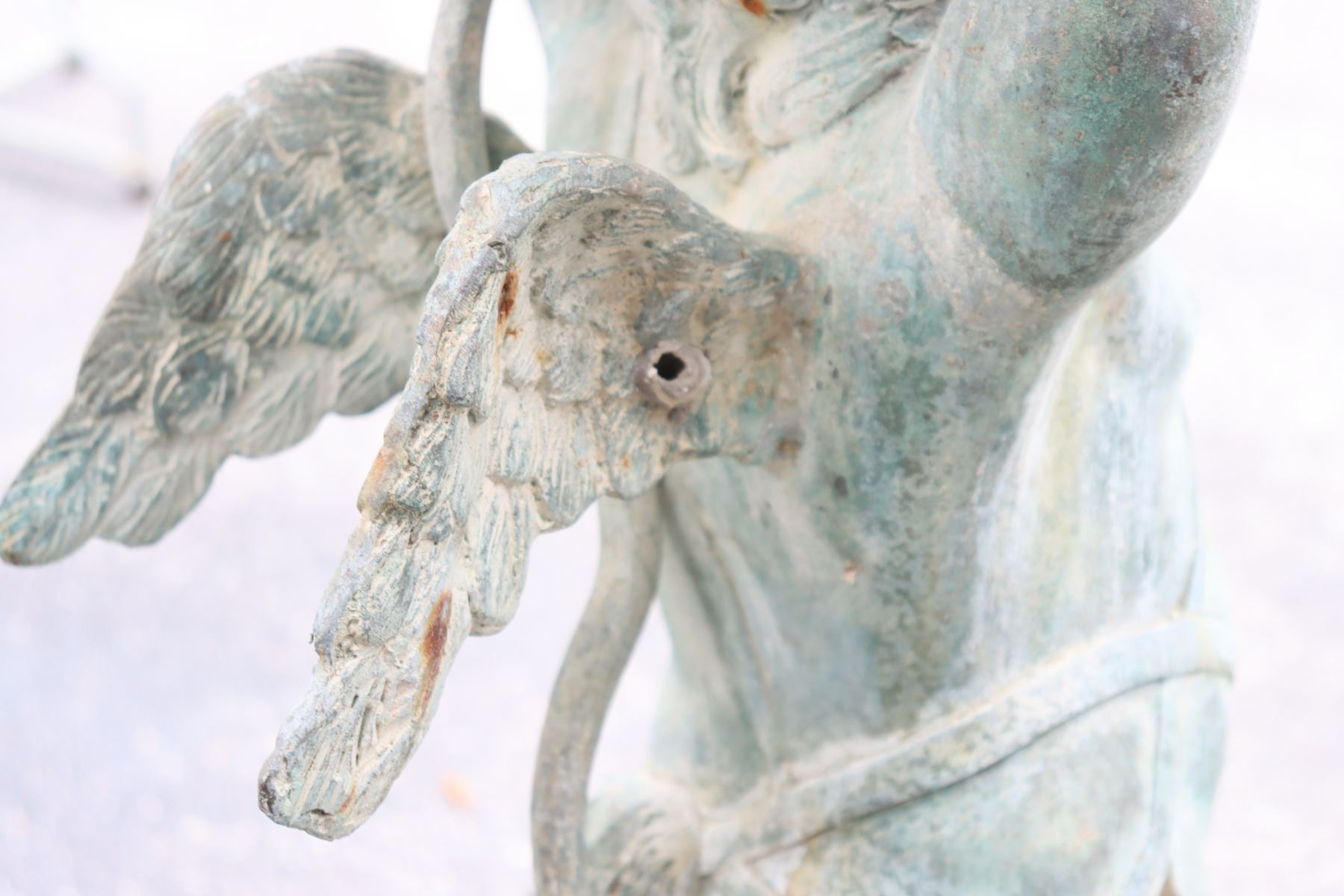 Two angel figures, or putti, holding planters, likely made of concrete. Condition commensurate with age.