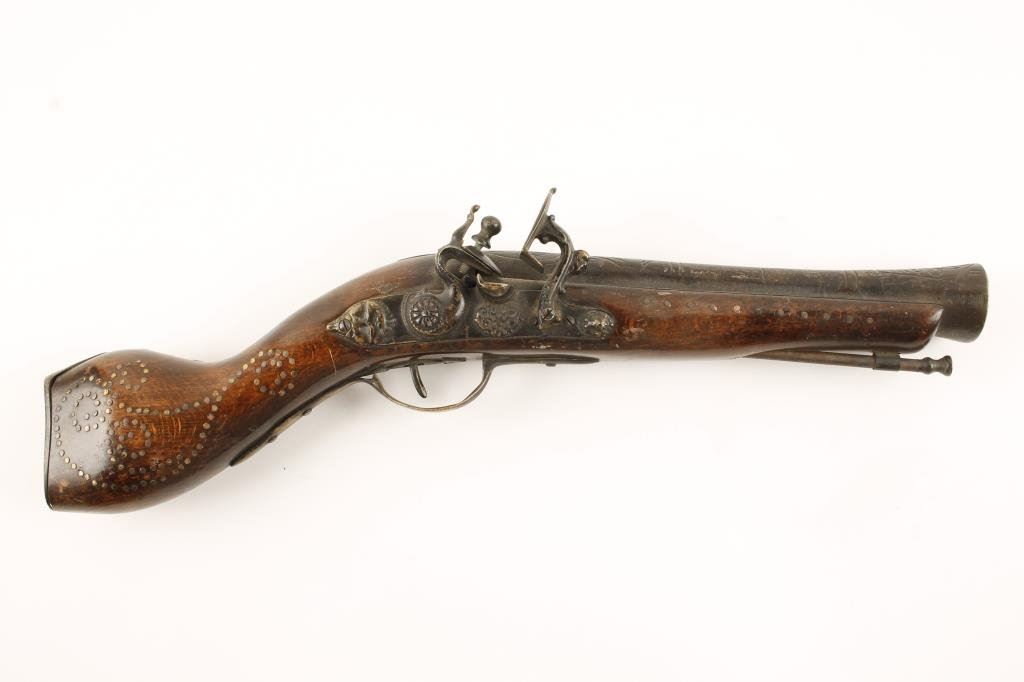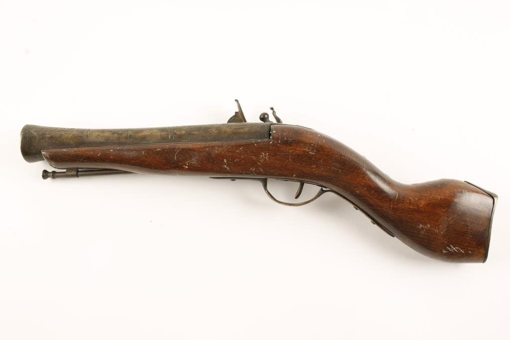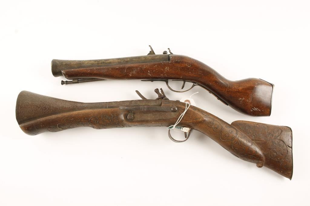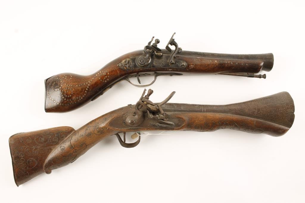 Pair of 20th Century blunderbusses; one has a snaphaunce action with engraved 9” barrel (18” overall), copper studded wood stock with brass mountings, working action and dark patina to metal surfaces. The other is a flintlock with ornately decorated 10” iron barrel, approximately 20” overall with wire inlaid wood stock displaying a dark patina to metal surfaces, action working; fair to good wood with some of the wire decoration missing. Est.: $250-$500.