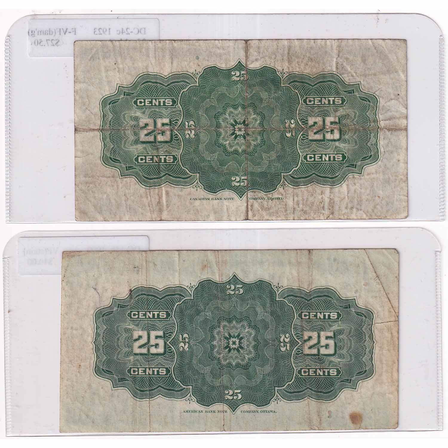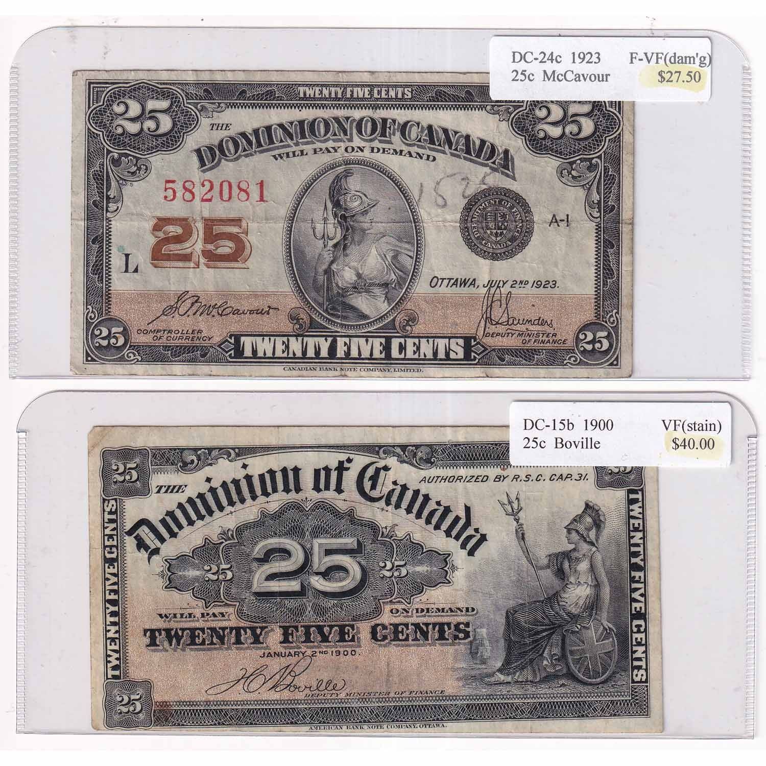 Pair of 25-cent Shinplaster Banknotes: 1900 DC-15b Boville VF (stain) & 1923 DC-24c McCavour F-VF (Damaged). 2pcs