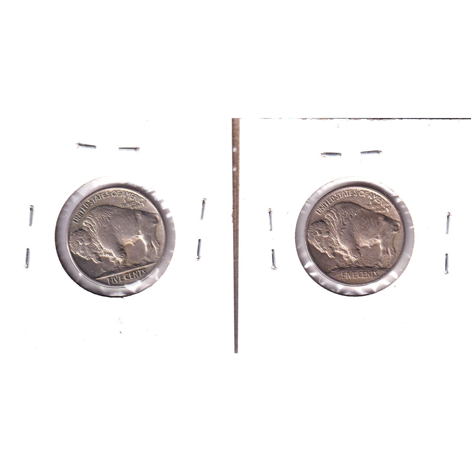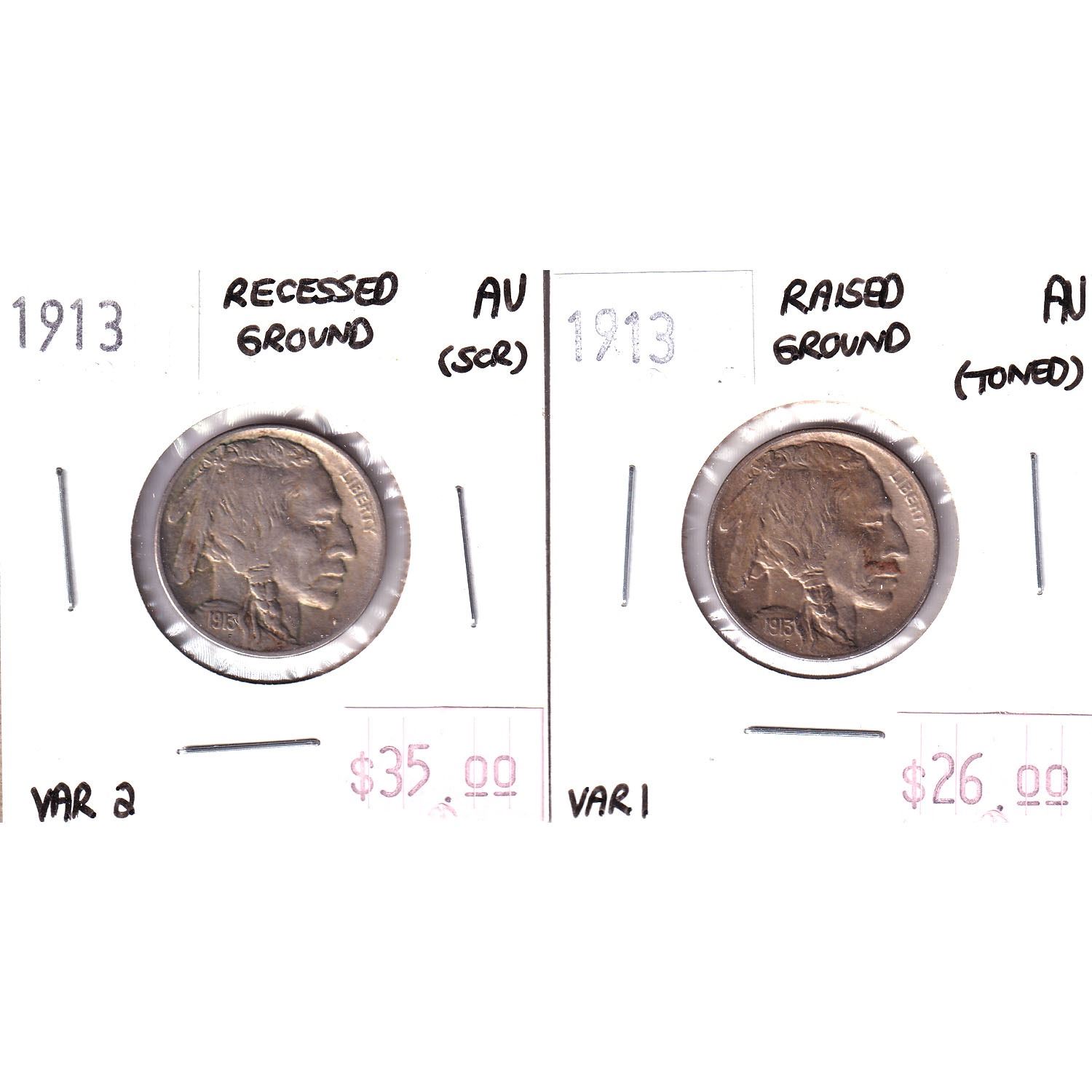 Pair of 2x 1913 USA Buffalo Nickels. Lot includes a Recessed Ground AU & Raised Ground AU. Coin has very minor scratch. 2pcs