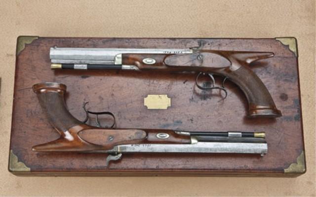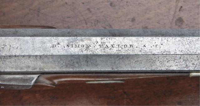 Pair of .50 caliber percussion saw-handled dueling/target pistols attributed to John Mullin, New York, circa approx. 1841. Barrels engraved “Dr. Simon Taylor, South Carolina” by maker. The pair belonged to Dr. Taylor, a South Carolina plantation owner and delegate to the confederate congress. By tradition the guns were taken from the Taylor plantation by General John Logan during General William T. Sherman’s Civil War campaign. Refer page 18, The Code of Honor: Dueling in America by Ellen N. Murry, which features the collection of Col. Orbelo. The pair remain in original good condition showing a light grey patina finish with traces of striping on barrels, strong evidence of case hardening on locks, some minor erosion and pinprick pitting just starting. The locks and mounts are nicely engraved with double gold bands at sat the breech and show double gold platinum blowout plugs. The pistols are equipped with adjustable set triggers, half stocked in select walnut, nicely checkered at the wrist. The stocks remain in very good condition with 80-90% varnish, good checkering, some minor marks and wear at the edges, storage scratches. The triggerguards show 20-30% original blue. The