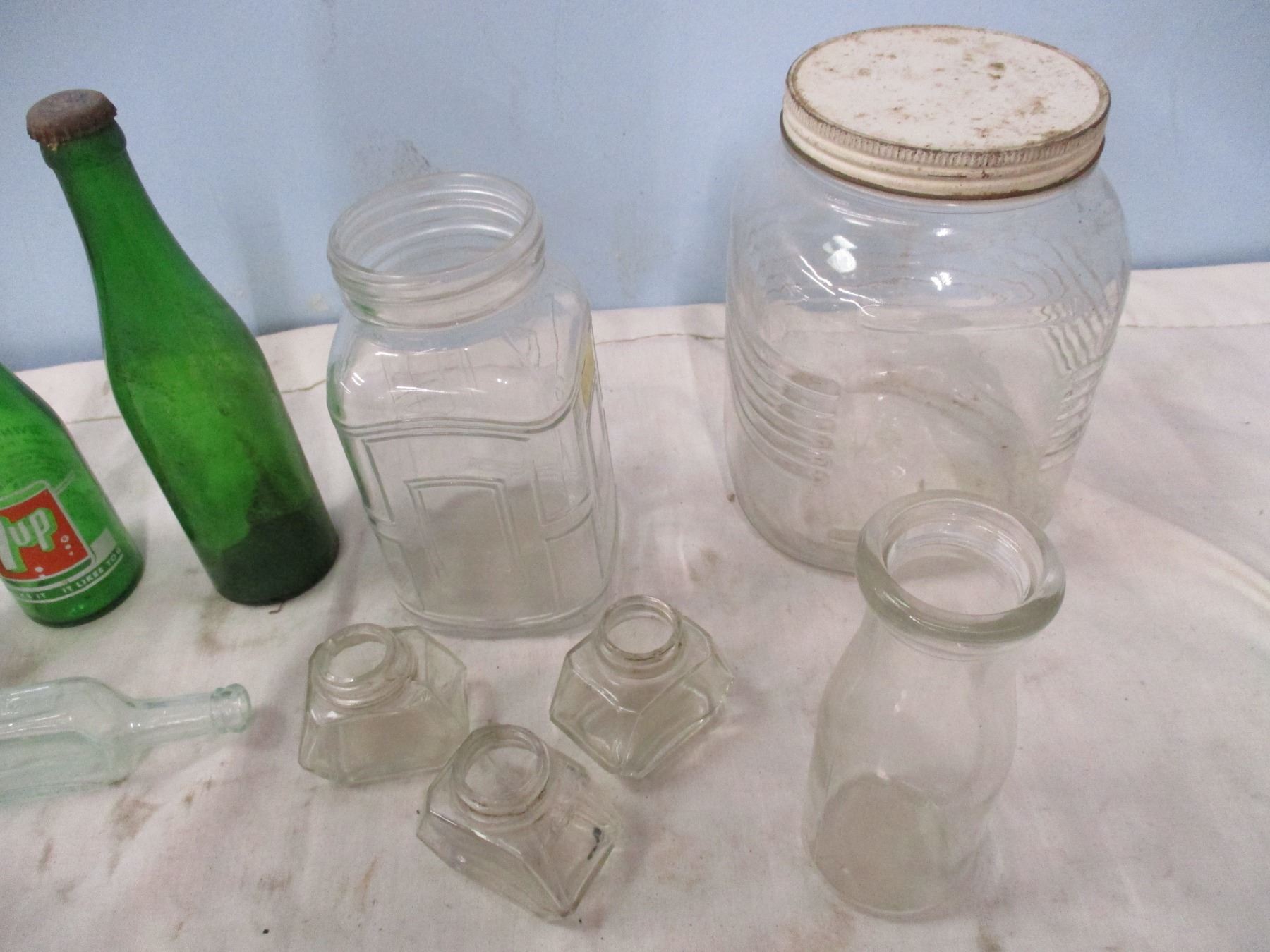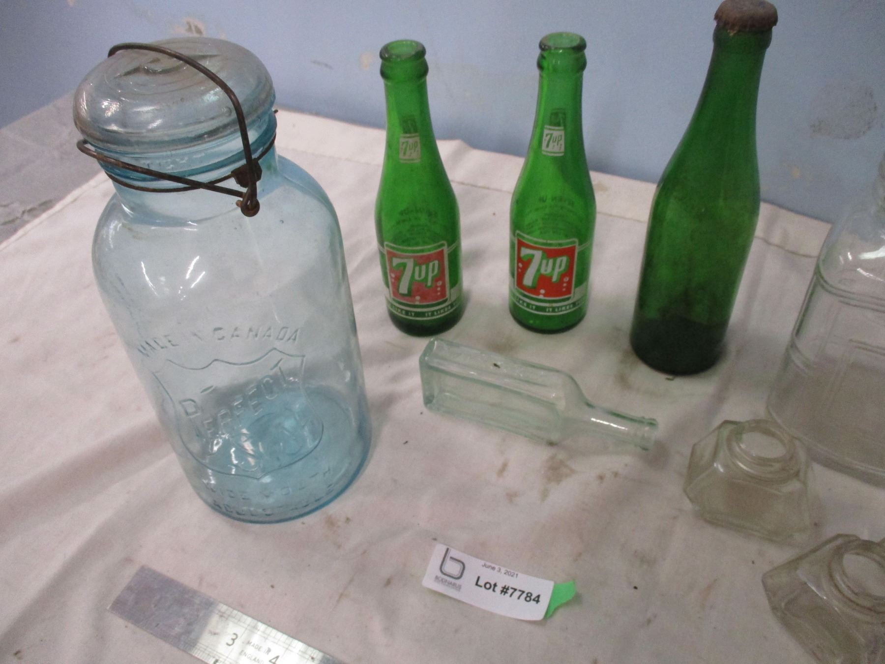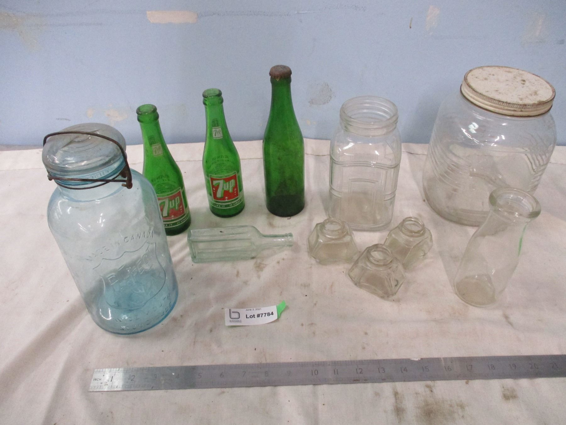 Pair of 7-Up Bottles and Assorted Vintage Glassware