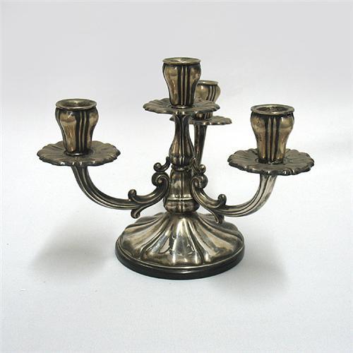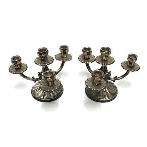 Pair of 800 silver candelabrum; each with center candleholder and three C-shaped arms extending out from standard; on round fluted base; mounted on black hard plastic bottoms; 7" high x 9" diameter; a few dents on candleholders and bases