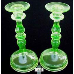 9" Pair of Vaseline Candlesticks with double ballustre bases (4 1/4") and 2 3/4" opening at the top. No damage.