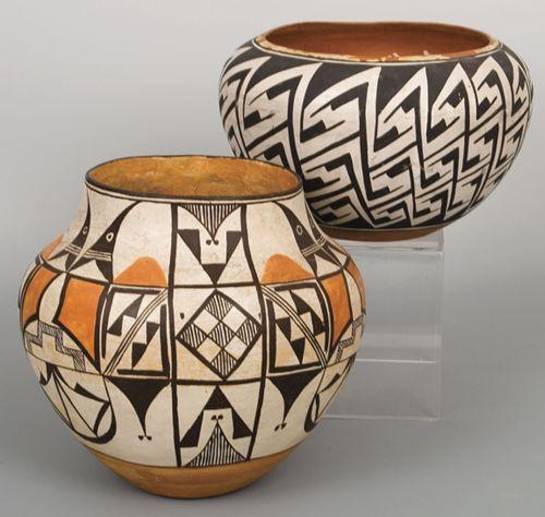 Pair of Acoma Pots. (1) Black and white designs on red slip, 5" x 9". Shows some rubbing. (2) Red and black designs on red slip, 8” x 9”. c. 1930s. Fine condition. (est $600-800)
