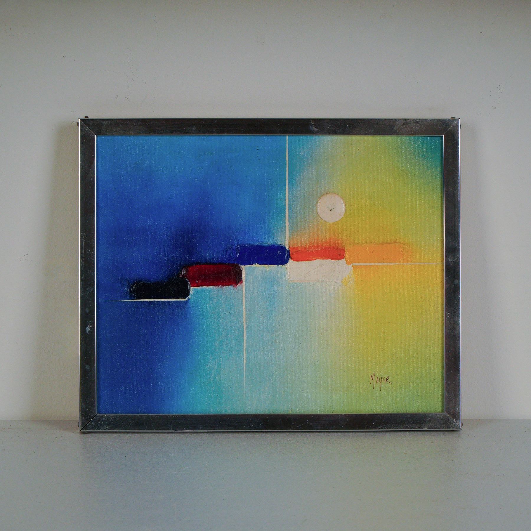 A pair of minimalist acrylic on canvas artworks by Mayer, both framed and showcasing the artist's signature use of bold color fields, ethereal gradients, and dramatic contrasts. The larger canvas draws the eye with a luminous sphere floating above deep cobalt blues and radiant yellows, evoking a dreamlike horizon. The smaller composition explores a more geometric approach with interlocking blocks of vibrant red, blue, black, and gold, unified by a glowing orb at its center. Both works feature areas of impasto that add tactile depth and movement to the surface. This pairing highlights Mayer's range of abstraction, from the atmospheric to the architectural, and together they create a visually compelling dialogue of light and color. Smaller painting signed Mayer at the lower right