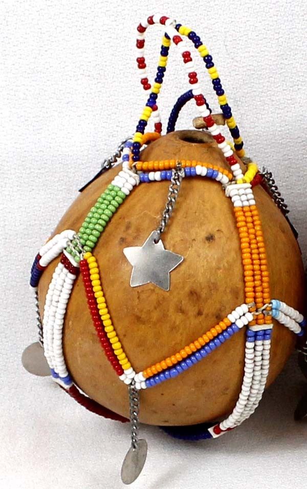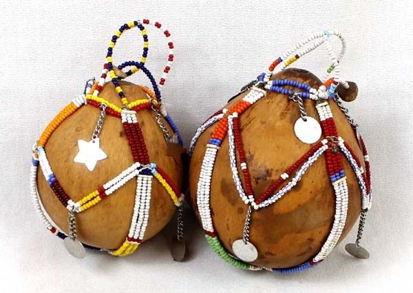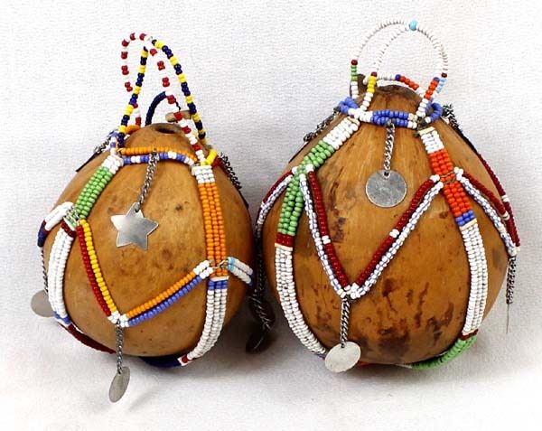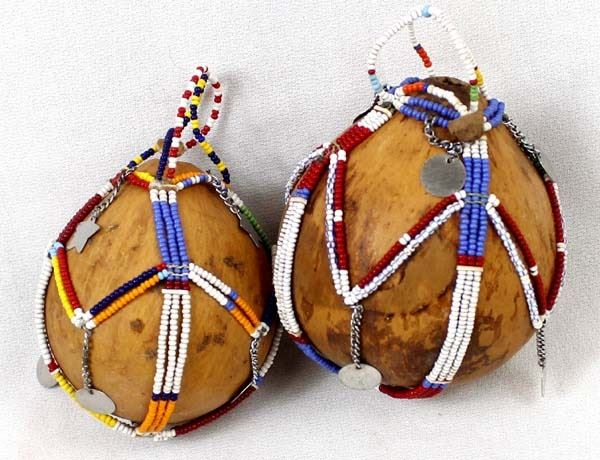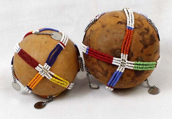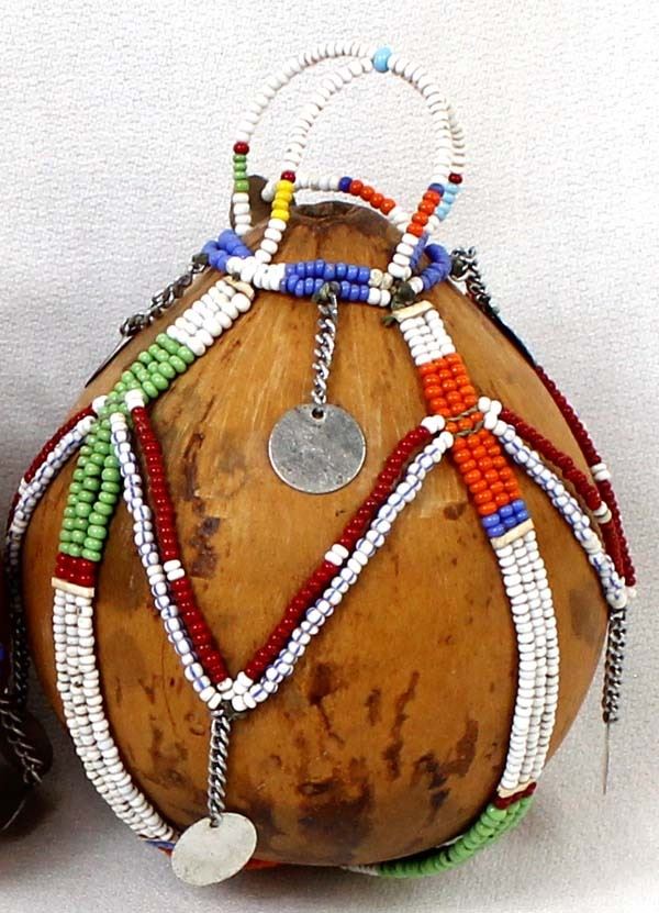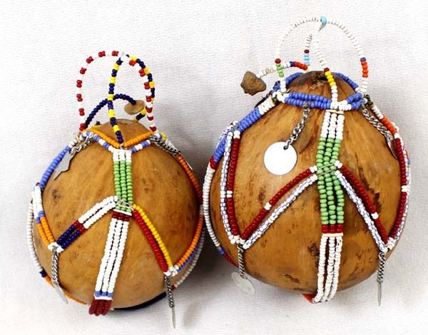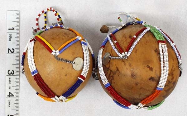 Pair of African Beaded Gourd Snuff Containers, measure 3.5''D, embellished with metal charms